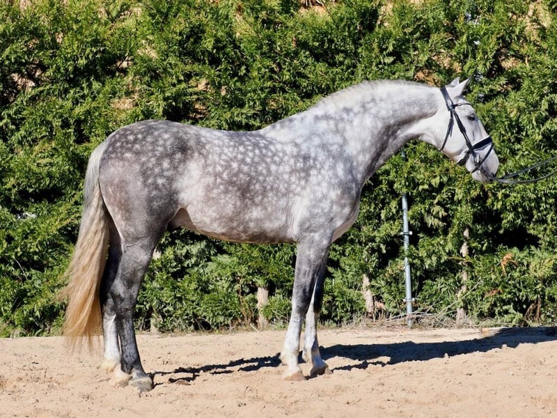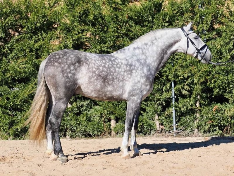 Beeindruckendes Pferd der Reinen Spanischen Rasse, geboren 2019, mit einer Größe von 1,68 Metern und herausragenden Eigenschaften für die klassische Dressur. Dieses Pferd zeigt außergewöhnliche Bewegungen und verfügt über eine fortgeschrittene Grundausbildung für sein Alter. Es ist im Piaffe-Training begonnen, führt Pirouetten und einzelne fliegende Wechsel aus und arbeitet korrekt an den Seitengängen. Sein großes Potenzial für den Hochleistungssport in der klassischen Dressur wird durch seine Abstammung aus einer Zucht bestätigt, die mehrere Jahre in Folge als beste Zuchtstätte für Dressurpferde auf der Weltmeisterschaft der Reinen Spanischen Rasse ausgezeichnet wurde. Ein elegantes, vielseitiges Pferd mit Gewinner-Genetik, ideal für Reiter, die Qualität und Perspektive in der Arena suchen.