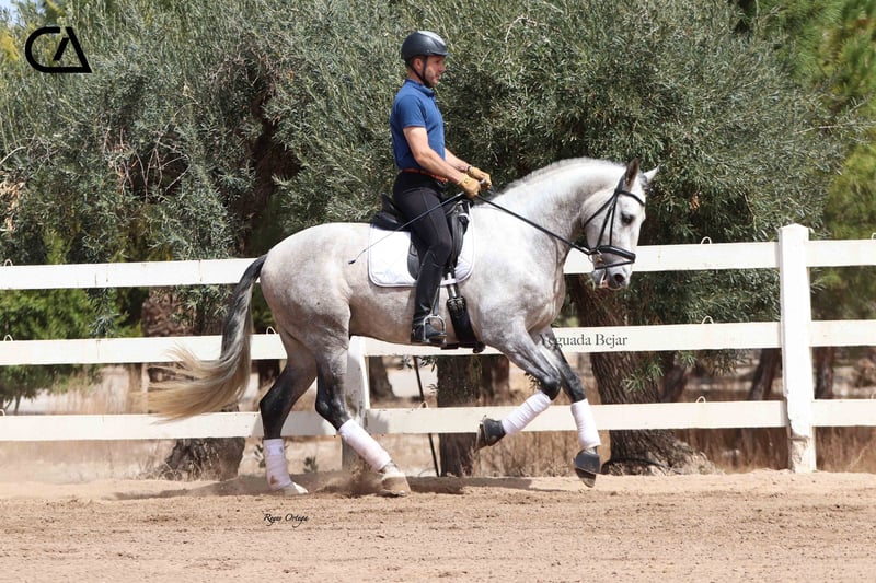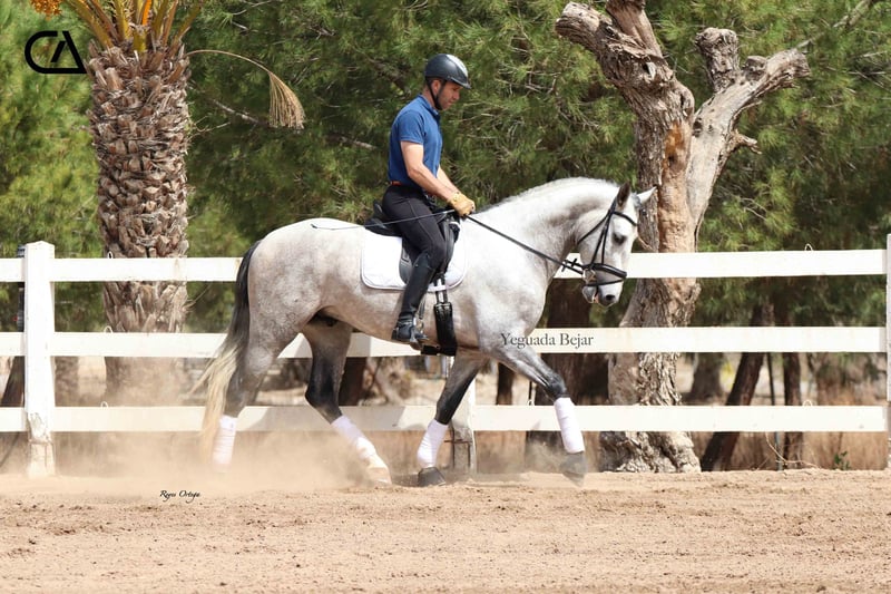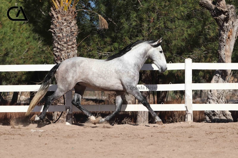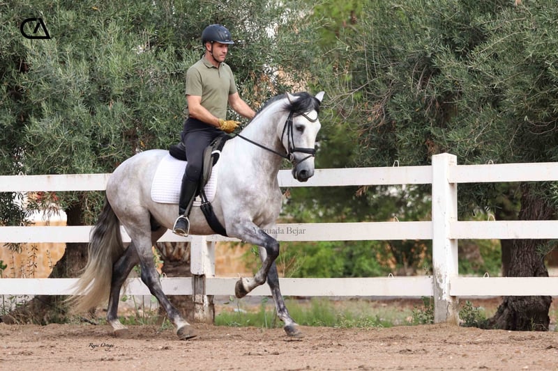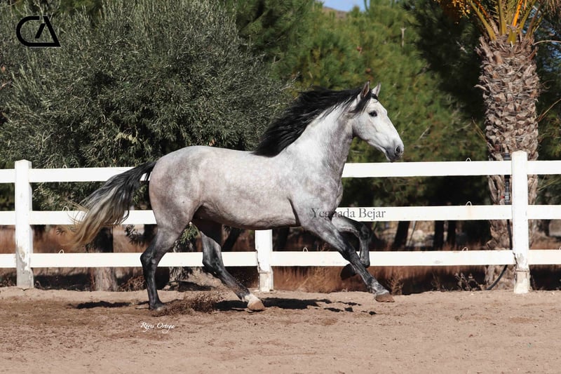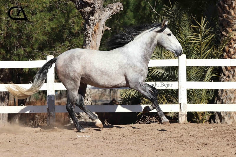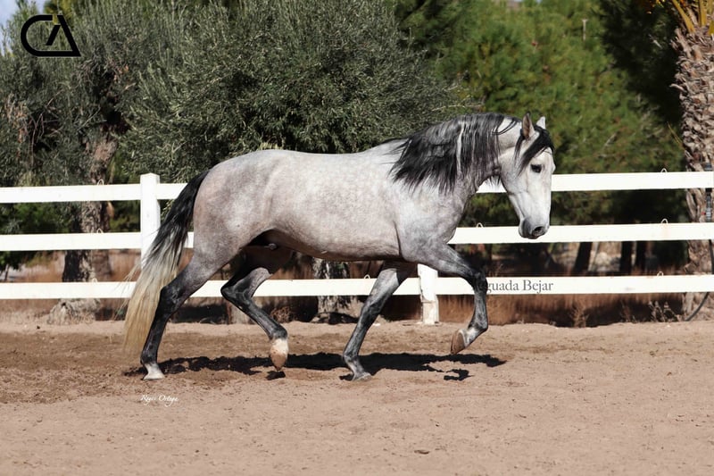 Quisco de Martet is a young gray horse born in 2019 and is 1.71 m high. He is a very beautiful stallion, with very good conformation and three high-quality gaits. His excellent character, extremely docile, makes him handle easy, besides he is sweet and confident with people. At the present, he has a basic level of dressage, and has very good aptitudes and predisposition for learning. His bloodline on his sire sides comes from Armas Felino, from Lagar, both from Yeguada Plaza de Armas, and from Navarro VI from Marín García. His mother is Felina XXXIX, raised by Yeguada Martet, and Lucero VIII's daugther by López-Monis farm. Quisco could be a nice project for the future, both for competition and enjoy with the family.