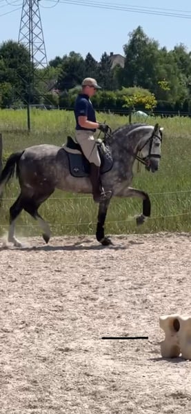 I offer for sale a beautiful Andalusian stallion with very good movement in all three gaits. Bombproof. Wonderful character. Very good head. Learns quickly. The horse performs flying changes, leg yields, and shoulder-in. Healthy. Easy to handle (shoeing, grooming). An ideal prospect for a dressage horse or working equitation. I highly recommend it.