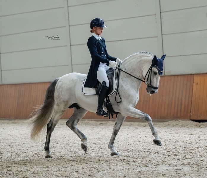 Elias Torreluna es un hermoso semental tordo con un carácter de oro. Elias es un caballo que te roba el corazón de inmediato con sus abrazos, su hermosa melena larga y su precioso brillo plateado. Tiene 3 aires muy buenos. Posee un buen paso, un trote amplio con muy buen posterior y un galope ascendente que es fácil de cerrar, es muy agradable de montar y realmente te da una sensación de asombro. Elias es un caballo adecuado tanto para un jinete ambicioso como para un jinete principiante. Elias está clasificado en ZZ Licht y se entrena a nivel ZZ Zwaar, tiene mucho potencial para passage y piaffe. Amazona mide 1.78. NL Stables Elias Torreluna ha logrado muchos resultados hermosos a una edad temprana. Durante el Campeonato Holandés MCI de Caballos Jóvenes 2023 fue subcampeón con una puntuación promedio del 86%. Este semental PRE también tuvo un buen desempeño durante el Campeonato Europeo en París, ganó la primera prueba en la categoría de caballos jóvenes y obtuvo una medalla de bronce en la clasificación general de esta categoría. En el proceso de selección para el Campeonato Europeo MCI 2024, Elias se convirtió en campeón holandés con una puntuación del 73% en la prueba y 77% en la kür nivel 2. Con esto, se califica nuevamente para el Campeonato Europeo MCI 2024 en Exloo. Aquí obtuvo el título de subcampeón europeo en Sevilla y ganó por segunda vez consecutiva, además de la plata individual, el oro por equipos. Además de sus logros en la pista con el MCI, Elias también tiene buenos resultados en las competiciones de la KNHS. Ha conseguido múltiples victorias entre los caballos de sangre caliente en Z1 con puntuaciones alrededor del 68% y en Z2 con puntuaciones alrededor del 67%. Elias quedó cuarto en el Z2 durante los campeonatos de interior de la KNHS 2025. Elias proviene directamente del criador Yeguada Torreluna, completamente aprobado incluyendo cuello y espalda.