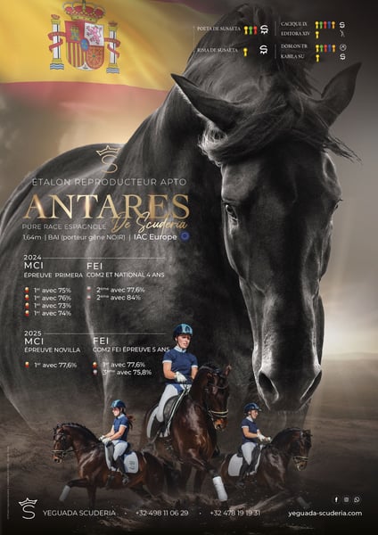 🌟 ANTARES DE SCUDERIA – Available in IAC (ERC Morette, Ternat) 🌟 PRE stallion, 5 years old – Son of the famous Poeta de Susaeta Antares de Scuderia embodies the modern PRE: frame, flexibility, power, and an exemplary temperament. He stands out with exceptional results for an Iberian, able to compete against German horses, and possesses extraordinary charisma: he never goes unnoticed. 🏆 Exceptional Performances • Winner in young horse competitions at 4 and 5 years old, with scores above 80% • Consistently winning in the MCI circuit, confirming his regularity and superiority in his category • Results also achieved against German horses, highlighting his extraordinary potential for a PRE 🧬 Prestigious Origins • Sire: Poeta de Susaeta, international reference and elite PRE stallion • Dam: Rima de Susaeta, best mare of our breeding • Pedigree featuring several elite stallions, the highest distinction of the PRE stud book ✨ Transmitted Qualities • Modern locomotion: uphill canter, powerful hindquarters, expressive trot, ample walk • Harmonious model, solid frame, and ideal neck orientation • Brave, generous, and reliable temperament, consistent both in competitions and at home • Charisma and presence: a horse that naturally draws attention • Worked under professional supervision 🎯 Our Breeding Vision Antares is a PRE that proves his qualities under saddle and in competitions, not just in free movement. We select our stallions after having worked with and evaluated them under saddle to verify their locomotion, temperament, and reliability. Too often, horses are judged solely on videos in free movement, which does not reflect their true quality. With him, you are sure to pass on horses made for sport, reliable and cooperative, and not just impressive to look at. 💡 An ideal choice to bring frame, locomotion, temperament, model, and charisma to your breeding.
