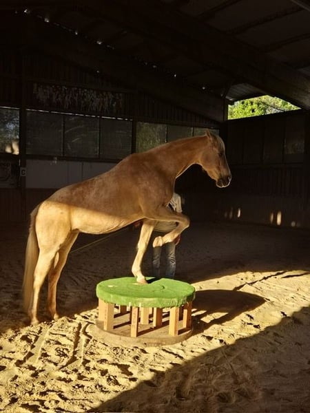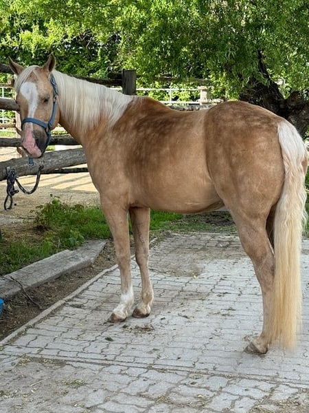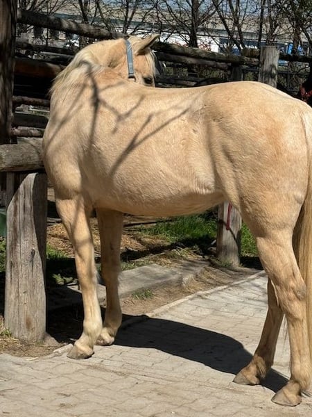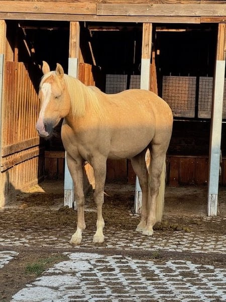 Colonels First Choice, 16-year-old Quarter Pony without papers. Palomino, 143 cm. Very people-oriented and trusting. As a companion horse. For horsemanship, groundwork, lunging, walks, circus lessons, and nature walks. Open to everything except riding. It simply stresses her out, and she doesn't really enjoy being ridden. It’s no problem to walk comfortably in a walk and trot with a riding pad and even without a saddle. In the field, she can become stressed when moving at faster gaits. It would be nice if she finds a home where she can just be and partake in any fun without riding demands. Only for light individuals or children, as she is very delicately built. Barefoot. Currently with Good-Smith adhesive shoes. An open stable with enough hay would be important, or daytime turnout in a paddock. Price negotiable, a good home is the priority.