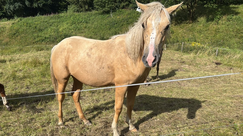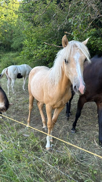 Aus persönlichen Gründen biete ich meine liebevolle, zweijährige Palomino Stute zum Verkauf an. Miley wächst artgerecht im Herdenverband auf und zeigt sich dabei sehr sozial, neugierig und menschenbezogen. Sie wird voraussichtlich ein Stockmaß von ca. 155 cm erreichen. Mutter und Vater können beide vor Ort am Stall besichtigt werden. ✨ Eckdaten & Ausbildung: • Geboren am 20.04.2024 • Farbe: Palomino • Endmaß ca. 155 cm • Aufgewachsen im Herdenverband • Kennt Hunde, Katzen, Traktoren & Kinder • Beherrscht das Fohlen-ABC • Anhängerfahren gewohnt • Regelmäßig beim Hufschmied vorgestellt • Regelmäßig geimpft & entwurmt Sie ist altersgerecht erzogen, brav im Umgang und zeigt ein ausgeglichenes, freundliches Wesen. Damit eignet sie sich ideal als zukünftiges Freizeit- oder Reitpferd für liebevolle Hände.