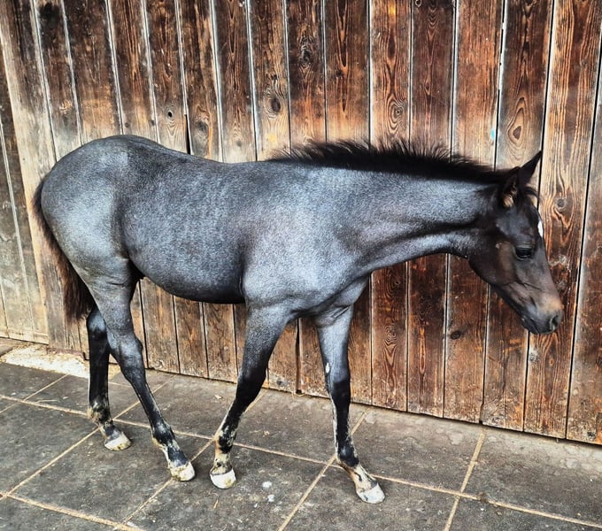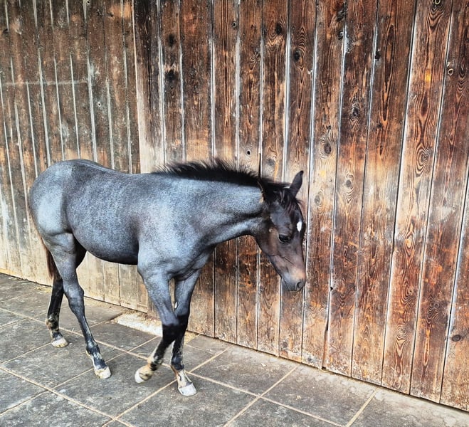 "PEPE Peppy Morena's No. 1" was born here on April 22nd this year. There’s no need to say much more about this exceptionally beautiful colt. Just take a look at the pictures... Pepe is an extremely well-built Quarter Horse foal with the rare blue roan (blue dun) coat color and incredible movement. He is not only outwardly stunning but also possesses an absolutely impeccable, gentle temperament and is very, very friendly—just as I know and love from his mother. Pepe is the first foal of my self-bred favorite mare, "Peppy Morena." She is a Quarter Pony mare with 75% fine Quarter Horse lineage. Her sire is the successful European stallion "EH One of Lena's Finest" from Eliesenhof. The dam line traces back to Ernst Peter Frey's "Peppy Moreno." The other, barely visible quarter is excellent Haflinger blood, which contributes vitality! Pepe's sire is the beautiful, compact "KJ Boogie Mac Hayes." So, our little Pepe is essentially a Quarter Horse... but due to his small Haflinger component and his dam, he receives a Quarter Pony equine passport from ZSSE e.V. This is no obstacle for sport or breeding purposes. Pepe can be gelded from December 2026 onwards. He is microchipped, vaccinated against tetanus, and regularly dewormed. He already knows riding in a horse trailer together with his mother. The more appropriate the future keeping environment, the more flexible we are in negotiations. ***We breed 2-3 Quarter Ponies each year*** Our foals are raised in a species-appropriate manner, on pasture and in an active stable, under the best conditions and continuous supervision, following organic farming standards. Since our young children are in the stable daily, we prioritize friendly, resilient horses. Additionally, our foals learn to recognize other animal species from an early age, such as during mixed grazing with our cattle, making them very confident early on. Through good daily handling, our young horses learn the basics of foal training within days after weaning, as they already follow us without halters into the trailer and other situations—excellent natural horsemanship conditions! Our next goal is to find a good pasture for Pepe and a future, well-supported, species-appropriate home for him. If you're interested, I look forward to your call or message, also via WhatsApp at 0176 56798081!
