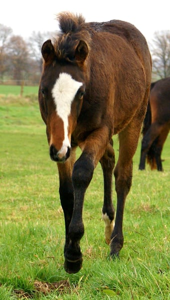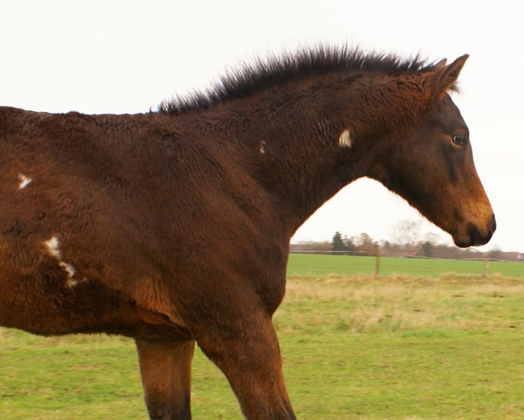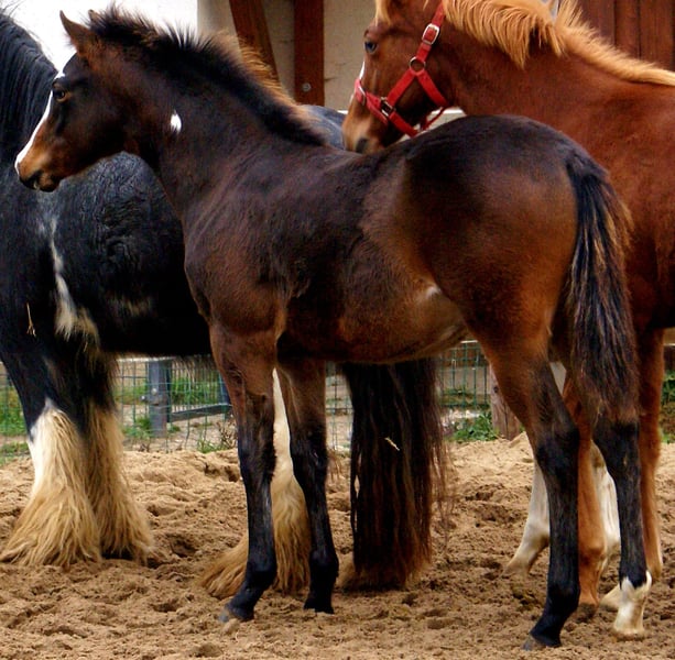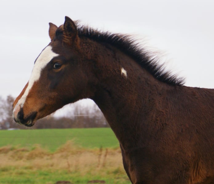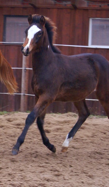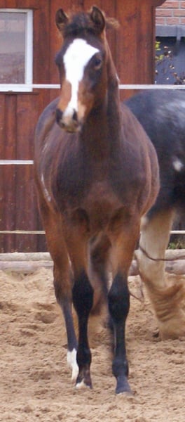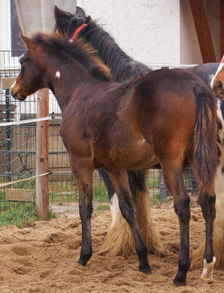 Charming Quarter Pony colt, dark bay with spots, sire: Paint Horse Kingsley n Jills Wood, dam: German Riding Pony by Kennedy WE. The foal comes with full papers and a passport from ZSSE. Raised alongside other foals, this friendly little heartbreaker features a distinctive blaze and a heart-shaped mark on its neck. Light-footed with expressive, large movements.