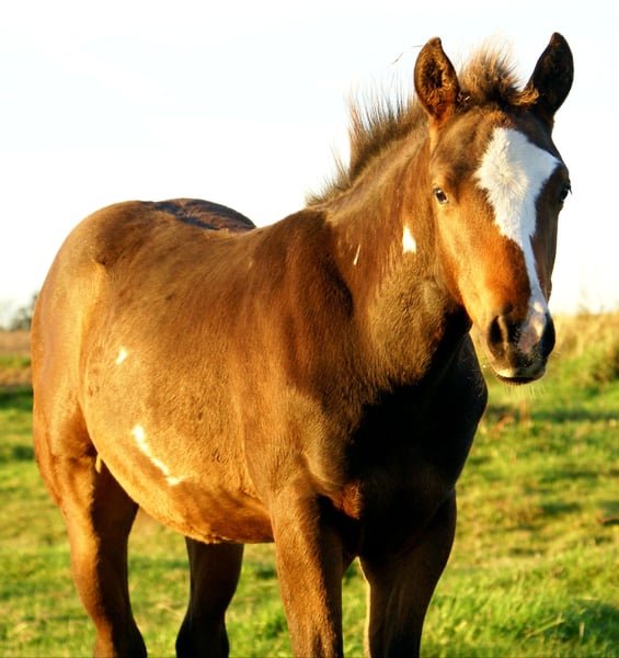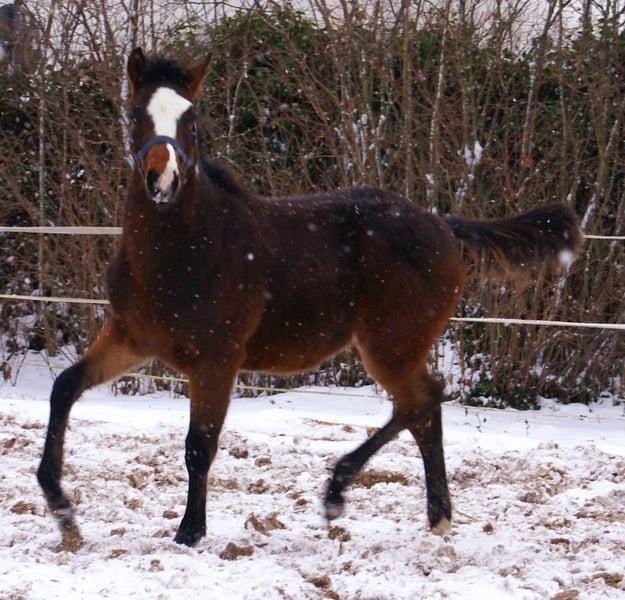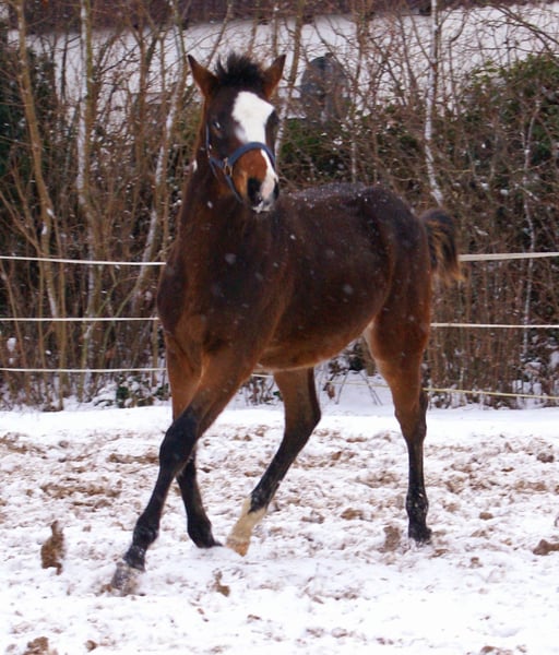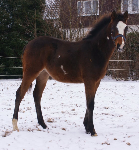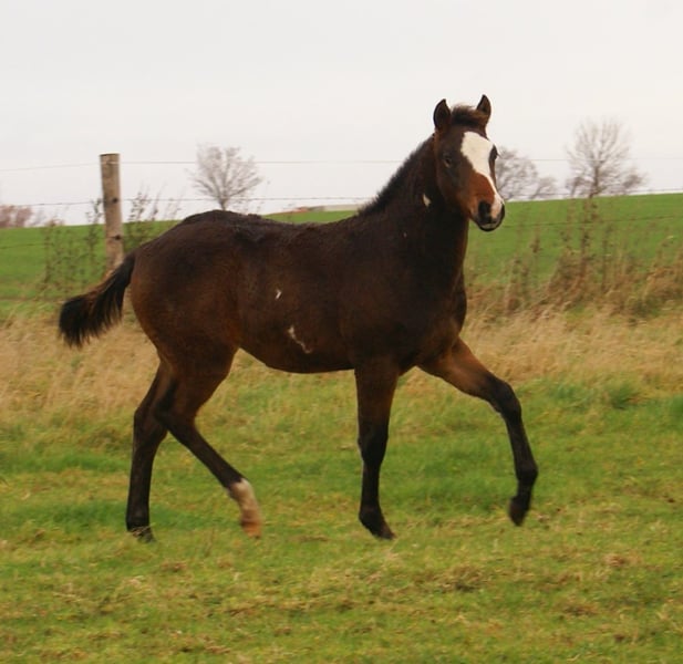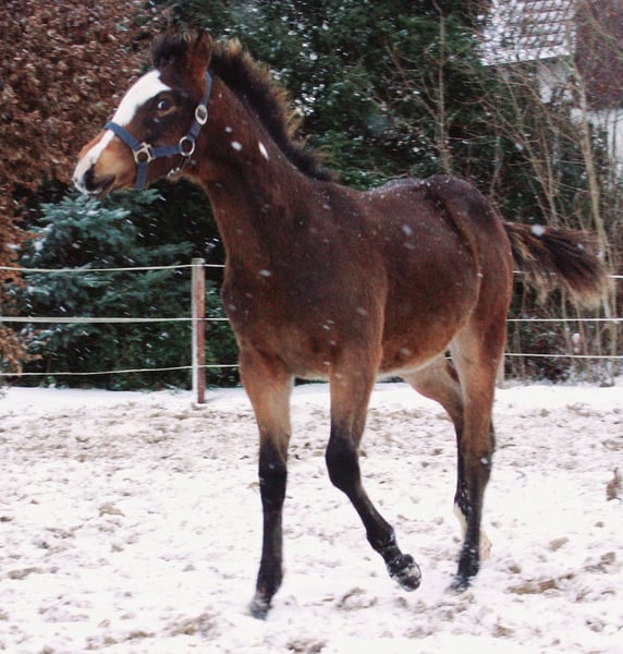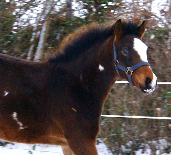 Charming Quarter Pony colt, dark bay with spots. Sire: Paint Horse Kingsley n Jills Wood; dam: German Riding Pony by Kennedy WE. He comes with full papers and a passport from the ZSSE. An outgoing little heartbreaker with a distinctive blaze, a stylish head, and a heart-shaped marking on his neck. Light-footed with large, graceful movements, elegant and agile. Suitable for dressage, and he is out of his German Riding Pony dam.