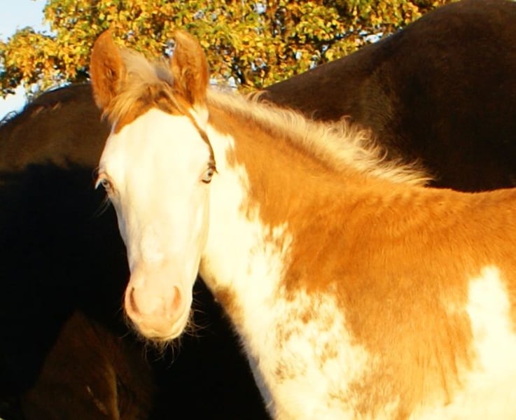 In auffälliger chestnut overo Optik präsentiert sich dieses Hengstfohlen mit 2 blauen Augen, Vater: Paint, Mutter: Deutsches Reitpony, das Fohlen hat volle Papiere, wüchsig, fröhlich, besonders