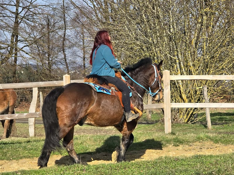 Kräftiger Freiberger–Ardenner Mix Wallach – brav geritten & gefahren Alter: 9 Jahre 25.4.2017 Stockmaß: ca. 157 cm Preis: 6900,- AKU: vorhanden ✨ Beschreibung: Dieser 9-jährige Freiberger–Ardenner Mix Wallach überzeugt mit seinem kräftigen, stabilen Körperbau und seinem absolut ausgeglichenen Charakter. Er ist ein zuverlässiger Partner im täglichen Umgang – freundlich, ruhig und unkompliziert im Stall sowie beim Putzen und Führen. Unter dem Sattel zeigt er sich brav und angenehm zu reiten. Er geht fleißig vorwärts, bleibt dabei stets kontrollierbar und vermittelt seinem Reiter ein sicheres Gefühl. Auch gefahren ist er und kennt die Arbeit vor der Kutsche. Dabei präsentiert er sich zuverlässig,und arbeitswillig. Ein vielseitiger Freizeitpartner mit Substanz – ideal für Reiterinnen und Reiter, die ein kräftiges, gutmütiges Pferd suchen. Geeignet für: Freizeitreiter, Wiedereinsteiger oder Fahrer, die einen stabil gebauten, geländesicheren und zuverlässigen Wallach suchen. Auch für kräftigere Reiter bestens geeignet. Unsere Pferde werden regelmäßig: – entwurmt – vom Schmied betreut – osteopathisch kontrolliert Hofladen: Westernsättel, Trensen & Zubehör Transport sowie passendes Equipment auf Wunsch günstig organisierbar Unser Service: ✅ 3 Monate Umtauschrecht ✅ Proberitt: 35 €, jedes weitere Pferd 25 € (beim Kauf am selben Tag angerechnet) ✅ 💰 Preisnachlass bei sofortiger Mitnahme oder Transport am gleichen Tag: • Preiskategorie 1: 100 € Rabatt • Preiskategorie 2 (ab 5.000 €): 250 € Rabatt ✅ Persönliche & ehrliche Beratung Anfragen bitte ausschließlich telefonisch: 0171 – 4001968 Erreichbar täglich von 8–20 Uhr ⚠️ Keine E-Mail oder WhatsApp ⚠️ Alle Angaben ohne Gewähr