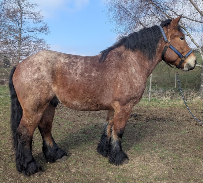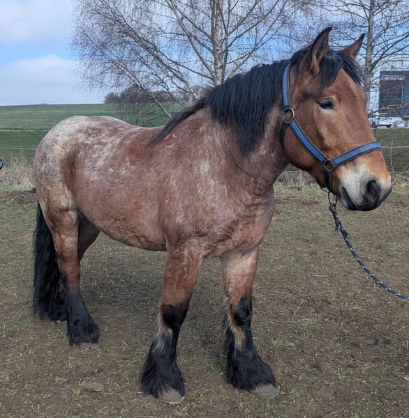 Umständehalber verkaufen wir unseren rheinisch-deutschen Kaltblut Wallach Oskar. Zur Zeit bilden wir Oskar als Fahr- und Arbeitspferd aus, dabei stellt er sich gut an. Bestimmt würde er sich auch als Reitpferd gut machen. Oskar ist 5 Jahre alt, hat ein Stockmaß von ca 170 cm und wiegt z. Zt. ca 800 kg. Er hat ein gutes Fundament, gesunde harte und gleichmäßig gewachsene Hufe. Oskar hat Papiere und Abstammungsnachweis. Er ist gelehrig und aufmerksam, verspielt, manchmal noch etwas schreckhaft. Oskar bleibt alleine im Stall und geht alleine von der Herde, er ist komplett beschlagen, (bisher kalt und ohne den Einsatz des Winkelschleifers). Oskar ist eher rangniedrig, nicht aufdringlich und doch den Menschen zugewandt. Er lässt sich problemlos verladen und fährt ohne Stress mit dem Anhänger. Wir geben Oskar nur in gute Hände, einen pferdegerechten Platz, möglichst mit Kaltblut Erfahrung. Bitte überlegt euch vor Kontaktaufnahme, ob ihr genügend Zeit, Lust und Erfahrung habt, euch mit einem jungen Pferd zu beschäftigen. Weitere Informationen findet ihr auch auf insta bzw. Facebook unter rosszeit oder unter rosszeit.de Für Interessenten mit einem konkreten "Oskarplan" stehe ich auch gerne telefonisch unter 0173 49 34 850 zur Verfügung. jo von rosszeit.de