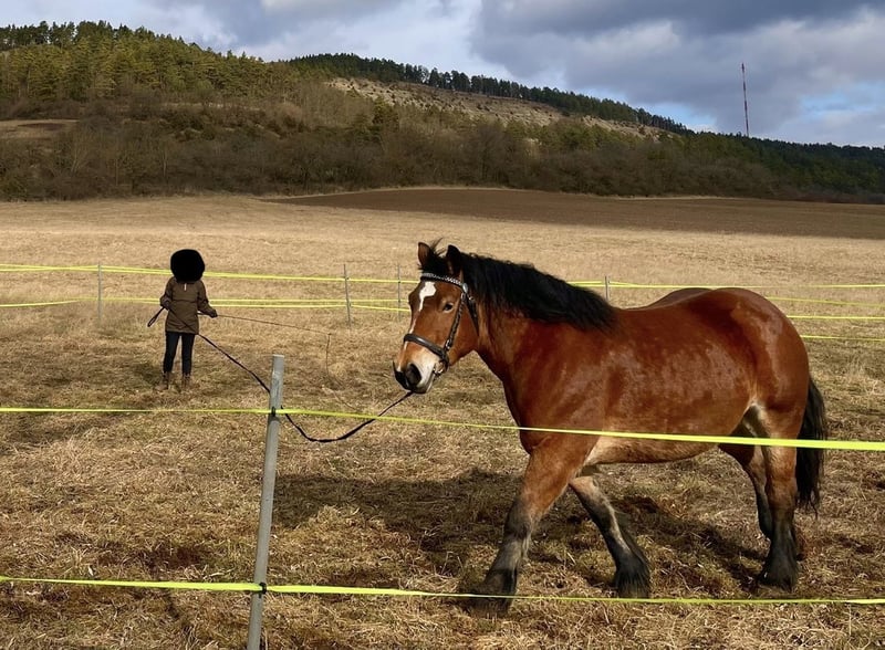 Tilda is a strong, eager to learn, and willing worker. When I ride her in the field, she often shows her temperament and can be a bit nervous. Her training is still in the early stages (lunging, double lunging, riding, harnessing). She has no trouble with hoof trimming. Tilda is accustomed to turnout in a herd environment. She requires an experienced horse owner who can support her according to her abilities and temperament. Unfortunately, I am unable to provide her with the necessary guidance due to lack of time, which is very unfortunate as she often gets bored.