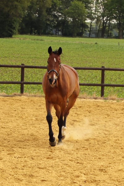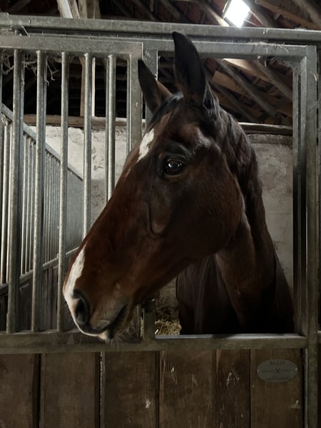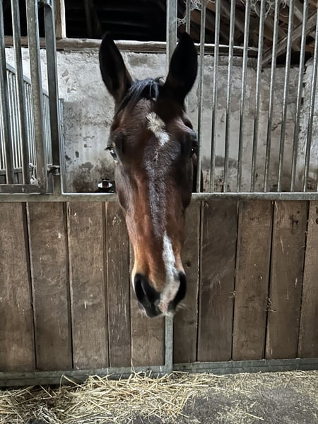 Cooper est un hongre de 14 ans, mesurant environ 1,70 m, qui a été mis hors compétition depuis avril 2024 en raison d'une blessure à l'œil. Il a passé l'été à l pasture pour laisser le temps à sa blessure de guérir. Très sensible, il est honnête et docile en main, y compris lors des soins chez le maréchal-ferrant et le vétérinaire. Je peux très bien l'imaginer en coaching, pour le travail à la longe, les exercices de cirque ou éventuellement en loisir. Il connaît les sorties à deux ou les promenades en solo. Hors de la blessure aux tendons, il est en parfaite santé, sans intolérances ni allergies. Actuellement, il ne passe pas bien la mise en camion. Je souhaite lui trouver un nouveau foyer chaleureux, idéalement avec une nouvelle activité qui lui donne du sens. Cooper est actuellement basé à Brünen/Wesel.