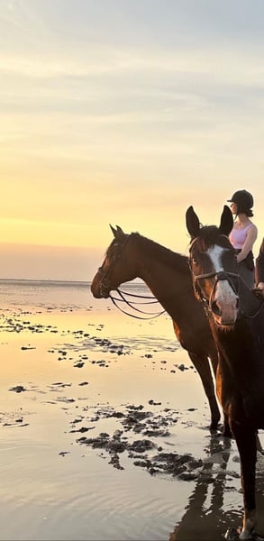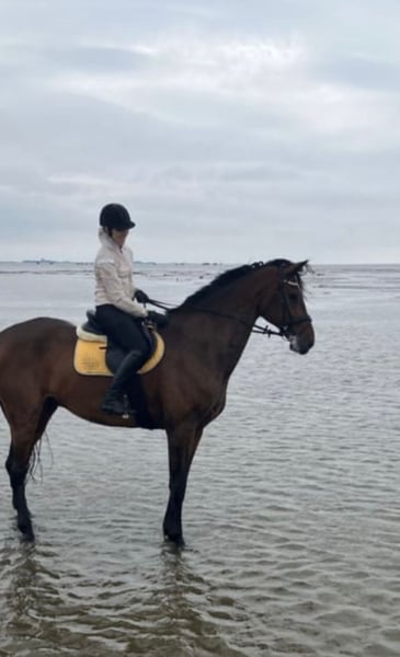 Hij is in het terrein zeer rustig te rijden en brengt veel plezier in de dagelijkse training. We hebben al mooie buitenritten gemaakt, soms met overnachting, door de heide en het Wernerwald tot aan Neuwerk (ongeveer 20 km per route vanaf de stal) en weer terug.