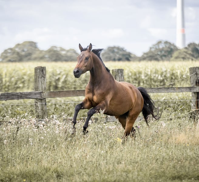Schweren Herzens suche ich ein neues Zuhause für mein Traumpferd. Er ist 5 jahre alt, hat ein Stockmaß von 1,64 m und eine solide und vorallem robuste Abstammung (Rüter von Ramiro x Landgraf I / Cor de la Bryere und Muttervater abstammend von Contender I x Florestan I.). Junior ist longiert und angeritten. Leider falle ich verletzungsbedingt seit fast 2 Jahren immer wieder aus und werde damit dem jungen Pferd nicht mehr gerecht. Darum entscheide ich hier klar Pro-Pferd, auch wenn es mir sehr schwer fällt. Junior kennt Kinder, Hunde, Traktoren und ist absolut unkompliziert beim Schmied. Auch abduschen ist für ihn kein Problem. Junior ist bei der Arbeit unkompliziert und lernwillig. Aktuell habe ich die Bodenarbeit im Fokus, da er daran wirklich Spaß hat. Im Alltag lässt er sich auch von Kindern händeln, ist aber aufgrund des Alters und Ausbildungsstandes kein Anfängerpferd. Junior ist ein sehr menschenbezogenes Pferd, begrüßt mich wiehernd auf der Wiese und möchte am liebsten immer ganz nah bei uns sein. Ich wünsche mir für ihn einen einfühlsamen, vielseitigen, ambitionierten Partner, der ihm die Zeit gibt, die er braucht und die Zuwendung, die er verdient. Er sollte in eine nette Herde kommen, in der es möglichst gleichaltrige Spielkollegen gibt. Er ist natürlich jährlich geimpft und regelmäßig entwurmt. Sein kürzlich angepasster Stübben Sattel kann auch erworben werden. Weitere Bilder oder Videos (auch als Fohlen) können auf Anfragen geschickt werden.