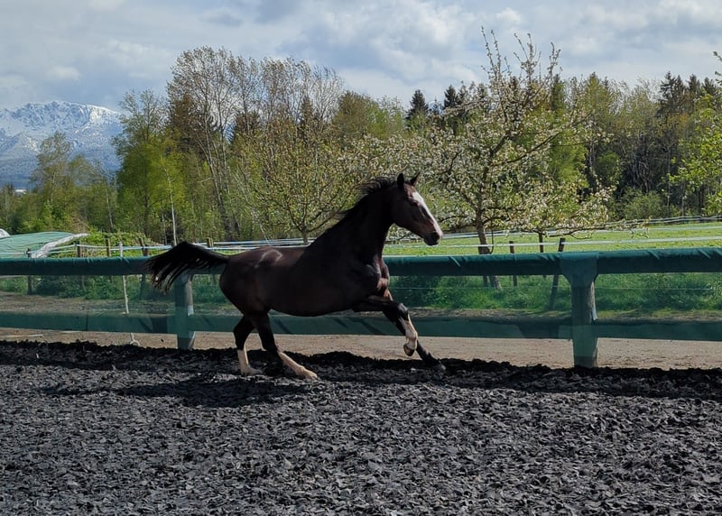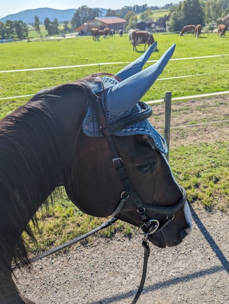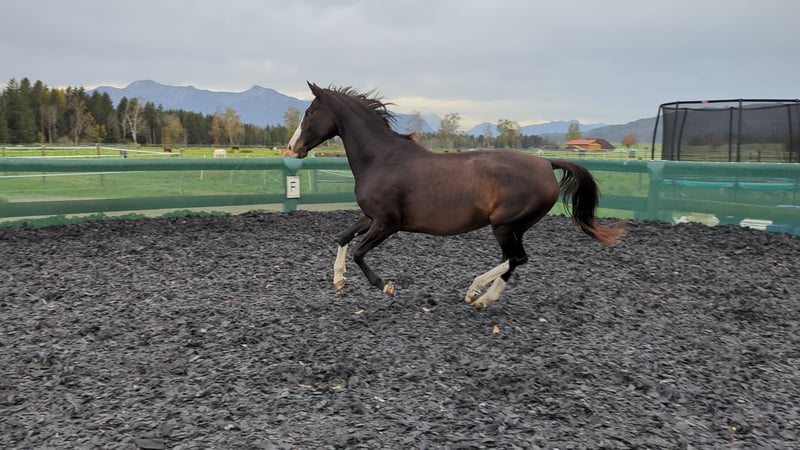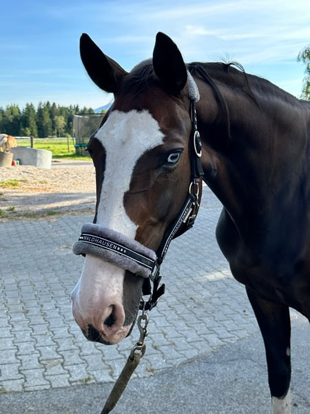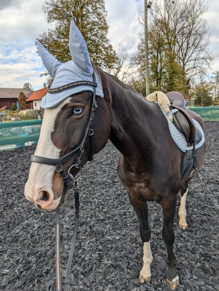 Poly is an energetic, sporty mare who has successfully competed and placed up to class L in show jumping in the past.