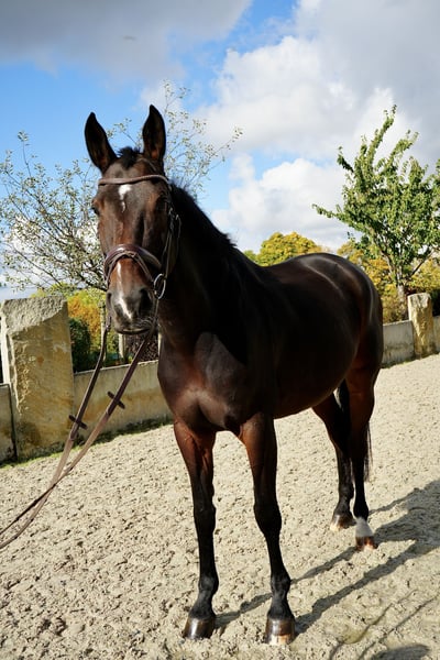 For sale is an 8-year-old dark bay mare by Coco Bongo Boy out of a Louis-le-Bon mare, born in 2017, with a height of approximately 16.1 hh. She has been trained with patience and sensitivity and has successfully competed up to class L. In show jumping, she demonstrates scope, ability, and a very reliable attitude. She is familiar with competition environments, remains calm and focused there, and makes it easy for her rider to feel comfortable. Her temperament is calm, balanced, and friendly. She possesses sensitivity without being complicated and works with motivation. In handling, she is very straightforward, loadable, farrier-friendly, and consistently pleasant in daily management. She also goes alone into the terrain and proves to be just as reliable there as in the arena. It is evident that she wants to please her handler – she works with engagement, listens attentively, and remains clear-headed. Thanks to her experience, character, and quality, she is an ideal match for ambitious amateurs or riders seeking a dependable sport partner with potential and heart. Serious inquiries are welcome to request further information or current videos.