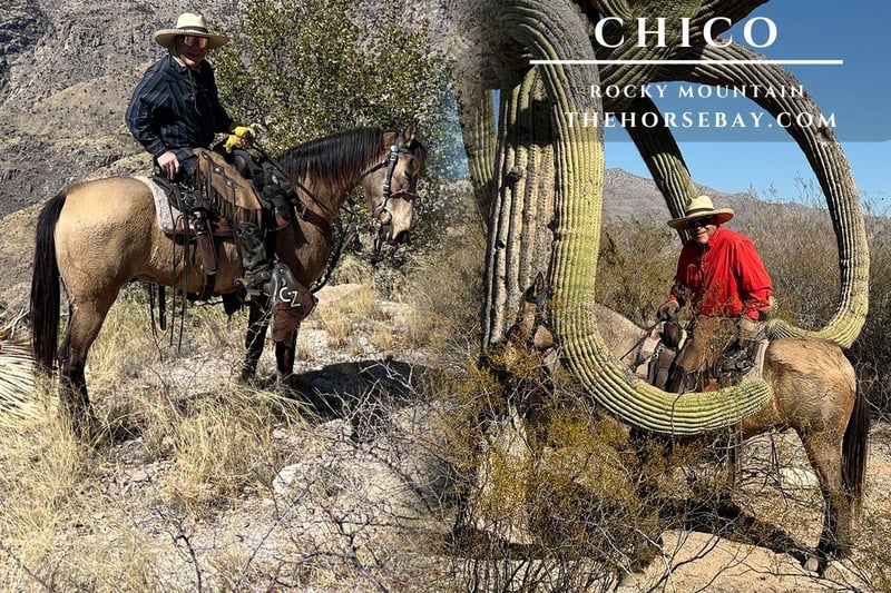 Chico, a Rocky Mountain horse, can do it all: back up, side pass, open and close gates, drag anything, front hobble, side hobbles, and both at the same time. Chico will cross creeks, rivers, and bridges. Chico knows vertical and lateral flexion and responds to leg pressure and obeys voice commands of walk, trot, and canter, and does a one-rein stop. Thousands of miles of trail riding experience in a wide variety of geographic terrains. He has never bucked, reared, bolted, or spooked, ever. He is as safe a horse as you will find. Chico has no bad habits and has a superb disposition, is easy to catch, and has lots of eye appeal.