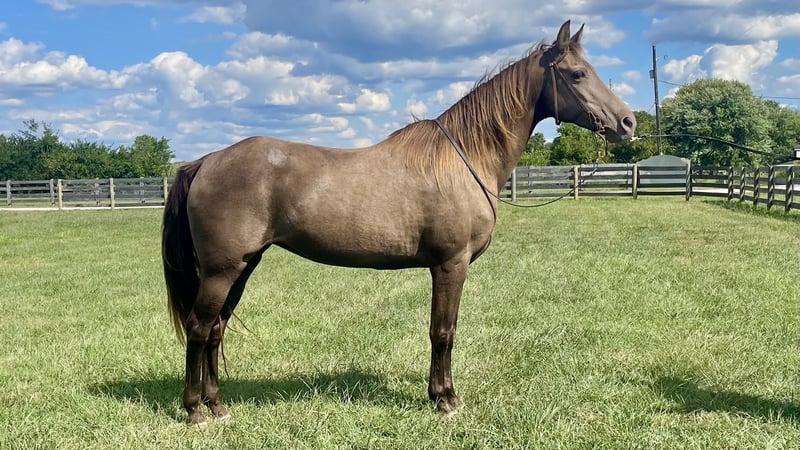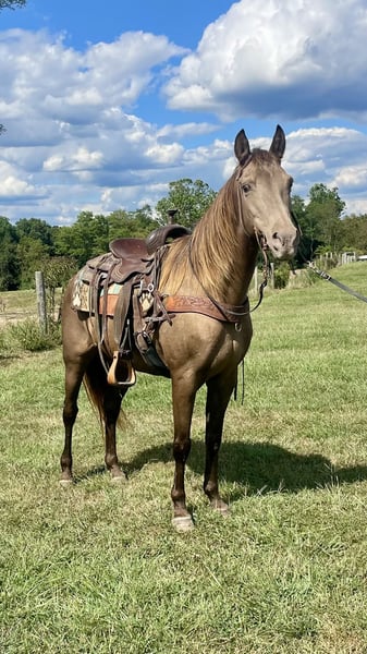 "AVAILABLE ON ONLINE HORSE AUCTION AT www DOT MagicHorseAuction DOT com BIDDING OPEN NOW thru TUESDAY | September 16TH! - BUY IT NOW AVAILABLE! *Final price will be determined on auction site* CONSIGNOR CONTACT INFO: Zach Brandenburg 513-508-3684 LOCATION: Moscow, OH Lady is a gorgeous champagne Rocky mtn mare that is 11 years old and stands approximately 14.3 hands tall. Lady is a well seasoned trail mount with a silky smooth gait that is natural and easy to sit. Lady rides out alone and in groups of any size, she is a nice sized horse with a pretty stocky build, she is friendly and willing on the ground and likes attention from her people but isn’t nippy or impolite. She stands for baths, grooming, saddling and mounting, Lady loads easily and trailers quietly. She has been hauled on week long trail rides and is used to saddle bags, trail dogs and picket lines. She is currently shod but has went barefoot with the previous owner.