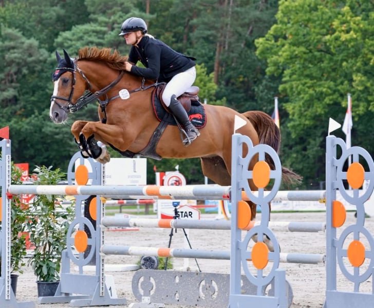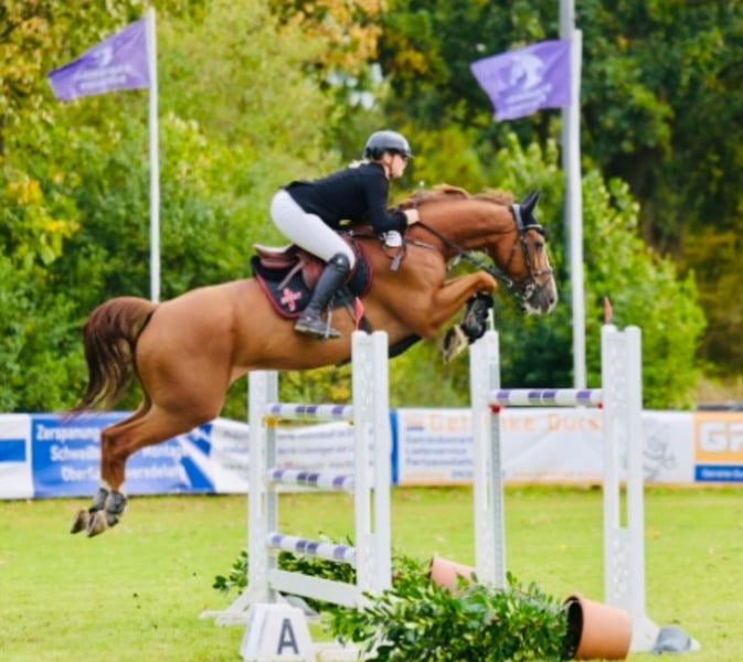 Urodzony w 2013 roku ogier Selle Français Dolmen du Tertre (v. Untouchable – Soir d’Avril V), około 169 cm w kłębie, jest wyjątkowym atletą o niepowtarzalnym charakterze. Z sukcesami i miejscami na podium aż do 1,50 m na arenie międzynarodowej, Dolmen nie tylko prezentuje sportową klasę, ale także cenną rutynę i pewność siebie na parkurze. Zawsze skacze pewnie na drugą stronę, wykazując zdolności, ostrożność i spokój – to koń, na którego można liczyć w każdej sytuacji. W codziennym treningu prezentuje się jako bardzo dobrze wyważony, chętny do nauki i skoncentrowany, przy tym zawsze uprzejmy i łatwy w obsłudze. Jego spokojny, zrównoważony charakter czyni go idealnym partnerem dla jeźdźców poszukujących doświadczenia, bezpieczeństwa i zaufania – zarówno jako niezawodny towarzysz na zawodach, jak i doskonały nauczyciel dla początkujących w wyższych klasach. Dolmen wyróżnia się nie tylko jakością, ale także wielkim sercem – to koń, który sprawia, że jeździec czuje, iż jest częścią prawdziwego zespołu. ❤️ ✅ Urodzony w 2013 roku ✅ Ogier, Selle Français ✅ Wzrost ok. 169 cm ✅ Rodowód: Untouchable × Soir d’Avril V ✅ Miejsce na arenie międzynarodowej do 1,50 m ✅ Doskonały charakter, dobrze jeździ, niezawodny, uczący ✅ Absolutny koń szkoleniowy z sercem i rozumem
