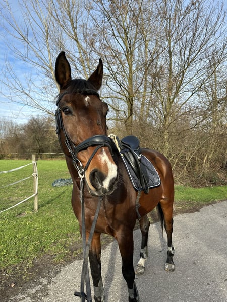 Neues Zuhause für meinen 15 jährigen bedingt reitbaren Selle Francaise Wallach gesucht Er war vier Jahre lang Schulpferd bei uns im Verein und ist jetzt seit über einem Jahr in meinem Besitz. Aus privaten Gründen muss ich ihn jetzt aber leider abgeben. Was ich mir für ihn wünsche: -Offenstall mit genug Bewegungsmöglichkeit für ein Arthrosepferd -kleine Herde (bevorzugt Wallachherde, aber aktuell steht er auch ohne Probleme in einer Paddockbox neben einer Stute) -er sollte 24/7 Heu bekommen, da er eher schwerfuttrig ist und ist und einen empfindlichen Magen hat Da er Arthrose in den Vorderbeinen hat (Röntgenbilder von Juli 25 vorhanden), wird er als bedingt reitbar abgegeben. Ansich kann er aber freizeitmäßig geritten werden. Er ist den Umgang mit Kindern durch die Reitschule gewöhnt, allerdings ist er kein Anfängerpferd und braucht einen sicheren Reiter. Im Gelände ist er vorallem in der Gruppe super entspannt. In unbekannten Situationen bleibt er lieber eher mal stehen um sich zu orientieren, zum durchgehen, bocken oder steigen neigt er aber nicht. Auf dem Platz braucht er einen ruhigen und geduldigen Reiter, da er gerne mal etwas übermotiviert wird. Er kennt es auch vom Boden gearbeitet werden, lässt sich am Halfter longieren und ist auch bei der Bodenarbeit aufmerksam dabei. Letztens haben wir klickern mit ihm angefangen, was er auch sehr schnell verstanden hat. Er ist regelmäßig geimpft und entwurmt worden. Die Zähne wurden im Dezember 2025 gemacht und er ist aktuell vorne beschlagen