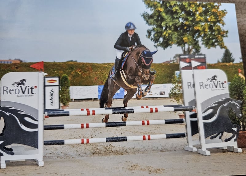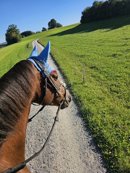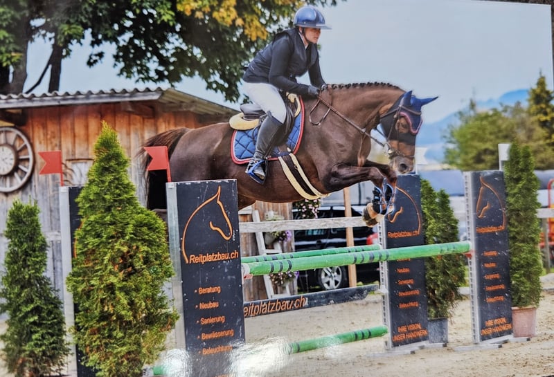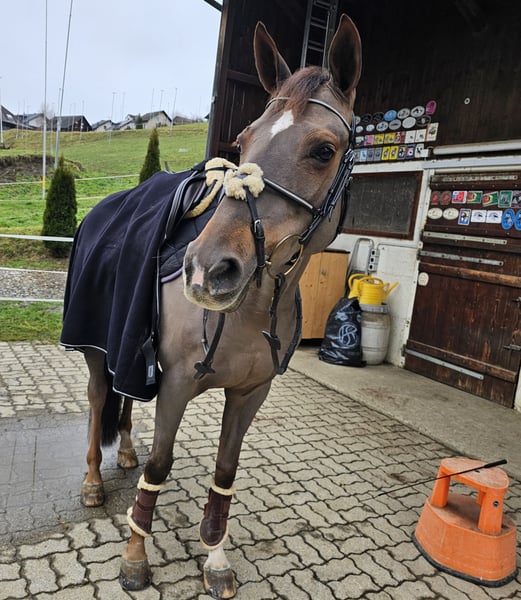 A la venta, una preciosa y bien formada yegua de 9 años de sangre Selle Français, hija de Up to You x Quick Star. Gzena es una yegua muy cariñosa y pegajosa. Tiene una gran afinidad con las personas. En el trabajo diario, siempre está motivada y es muy amable. Además, no es una yegua que se ponga nerviosa ni se ponga a saltar. A Gzena le gusta mucho ir sola o en grupo al campo. Es completamente segura en el tráfico. Esta pequeña yegua de color castaño con marcas de fuego tiene experiencia en competición. Sin embargo, se emociona un poco y no es la más fácil a la hora de saltar. Si está interesado y tiene más preguntas, no dude en ponerse en contacto. Para la prueba de salto, se cobrará una tarifa de 50 CHF, que se descontará en caso de compra.