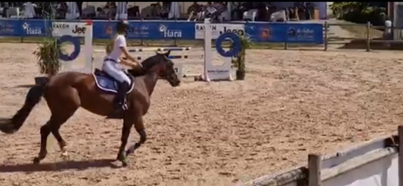 Ze is 7 jaar oud en 1,65 cm hoog. Ze is heel makkelijk te rijden en goed getraind. Ze gaat alleen of met iemand naar buiten. Scheren en transport zijn geen probleem. Ze heeft nog niet veel wedstrijdervaring, want ze heeft dit jaar haar eerste shows bij ons gelopen, maar ze klimt thuis zonder problemen 1,20 m. Ze heeft sinds deze zomer een perfecte dierenartscontrole (röntgenfoto's en kliniek). Ze is in april bij de tandarts geweest en in maart bij de osteopaat. Haar vaccinaties zijn up-to-date. Ik kan haar tegen een meerprijs bezorgen.