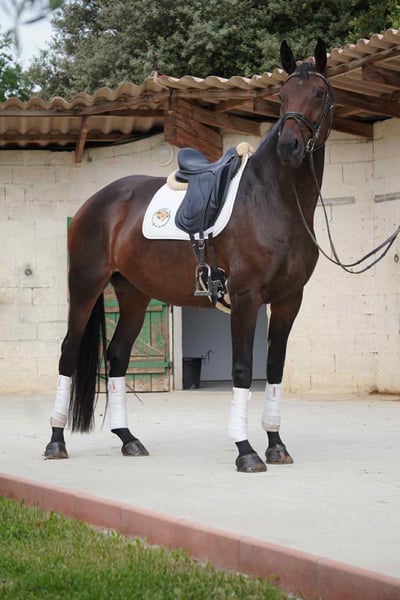 Z przyjemnością przedstawiamy wspaniałą klacz Selle Français w wieku 5 lat, pochodzącą od Van Gogh du Val (z Fürst Romancier) i matki po Pik Noir. Ten wysokiej jakości rodowód łączy siłę i elegancję ojca z regularnością i znanym charakterem linii matczynej, oferując tym samym interesujący potencjał zarówno na przyszłość sportową, jak i hodowlaną. Pochodzenie: Ojciec: Van Gogh du Val (z Fürst Romancier) – nowoczesny i wydajny ogier, ceniony za swoją moc, elastyczność i wspaniałe chody. Przekazuje swoim potomkom ekspresyjną lokomocję i prawdziwy potencjał do wysokiego poziomu ujeżdżenia. Ojciec matki: Pik Noir – potomek linii uznawanej za wysoką jakość charakteru, solidność i regularność, który również wnosi siłę i niezawodność. Cechy: Ta klacz prezentuje harmonijną i elegancką sylwetkę, z elastyczną i rytmiczną lokomocją, która od razu przyciąga uwagę. Jej stęp charakteryzuje się naturalnym pięknym ruchem i doskonałą elastycznością, co zapewnia przyjemność z jazdy. Łatwa do eksponowania, dobrze porusza się, jest reaktywna i zawsze z przodu nogi, co sprawia, że praca z nią jest przyjemna i rozwijająca. Jest to bardzo łagodna klacz, łatwa w pielęgnacji i codziennym użytkowaniu, która jest blisko człowieka i ma zrównoważony temperament. Już miała źrebaka, co czyni ją również interesującą klaczą do przyszłych projektów hodowlanych. Potencjał i przyszłość: Dzięki swojemu pochodzeniu, pozytywnemu nastawieniu i wysokiej jakości lokomocji, ta klacz ma wszystkie atuty, aby spokojnie rozwijać się do poziomu Amateur 1 i wyżej, pozostając jednocześnie bezpiecznym i przyjemnym wierzchowcem dla jeźdźca, który pragnie się rozwijać. Reprezentuje prawdziwą okazję dla wymagającego amatora lub jeźdźca, który pragnie połączyć przyjemność, bezpieczeństwo i potencjał sportowy, zapewniając jednocześnie konia o zdrowym umyśle i łatwego w codziennym zarządzaniu.