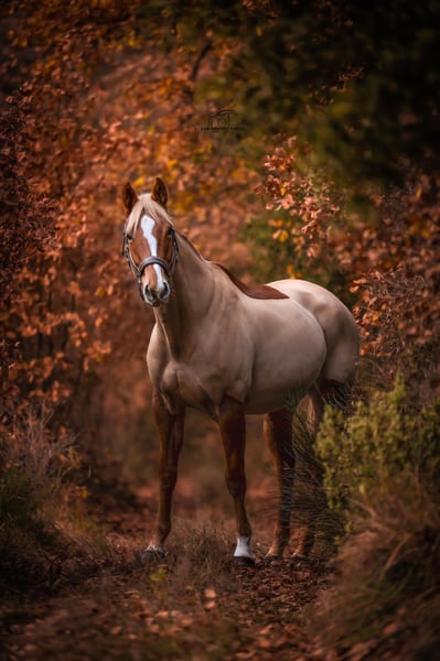 We are pleased to present Kadence de Kersentec, an elegant, chestnut Selle Français mare with washed-out mane, born in 2020 and standing approximately 16.1-16.2 hh. She combines style, a harmonious build, and graceful movement, blending prestigious sporting bloodlines with a generous temperament. Sire: Kama d’Amaury (by Quidam de Revel) A Grand Prix show jumper, ranked 3rd overall and by age in 2006 (FFE record), ISO 151. Full brother of Bianca d’Amaury, an international winner under Rodrigo Pessoa’s saddle and ranked among the top 10 sport mares worldwide (2000-2003). Kama is also brother to Géronimo Bleus d’Amaury (CSI, ISO 141) and Havane Bleus (CSIJ/CSI, ISO 149). Dam’s sire: Quality Bois Margot (by L’Arc de Triomphe) From a line renowned for versatility and sporting potential. Kadence de Kersentec exhibits a balanced, stylish conformation, with a pretty head and well-balanced movement. Her build is rather horizontal, and she will benefit from flexibility work to enhance engagement and hip flexibility. Under saddle, she shows willingness and attentiveness: Dressage: basic training acquired, working on correct contact. Show jumping: developing rhythm and respect, with real potential to perform up to Amateur Elite level (1.25-1.30 m). Eventing: positive cross-country experience, full of heart and enthusiasm. Outdoors: willingly ridden alone or in company, safely. She is a rather cool-minded mare, not dull, sensitive but resilient, always willing. She requires trust and a genuine bond with her rider. Easy to care for, sometimes a bit “mareish,” but practical and pleasant to handle daily. She is ideally suited for an amateur rider with at least level 4/5 riding skills, aiming to develop a young mare with potential, though not suitable for children. Complete follow-up, osteopath and dentist up to date. Hoofed and shod on all four feet. With her elegant build, generous temperament, and prestigious bloodlines, Kadence de Kersentec is a young mare with potential for Amateur Elite in show jumping. Versatile and very pleasant to live with, she will appeal to a rider eager to progress while building a genuine trust-based relationship.