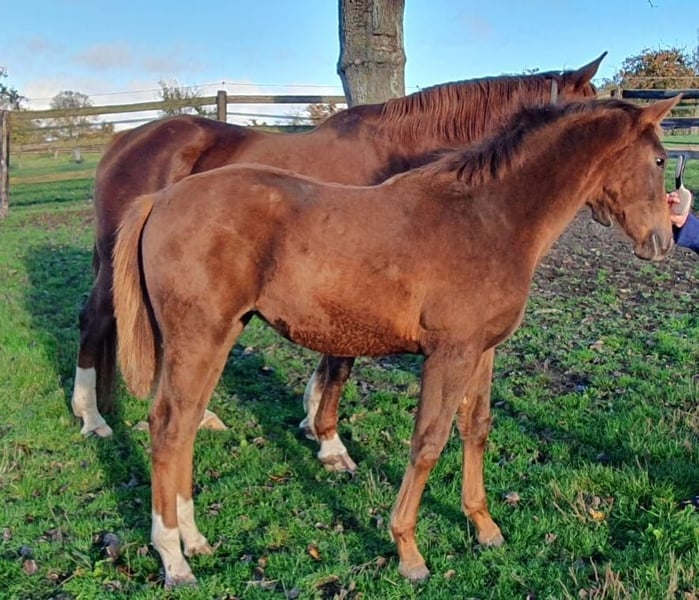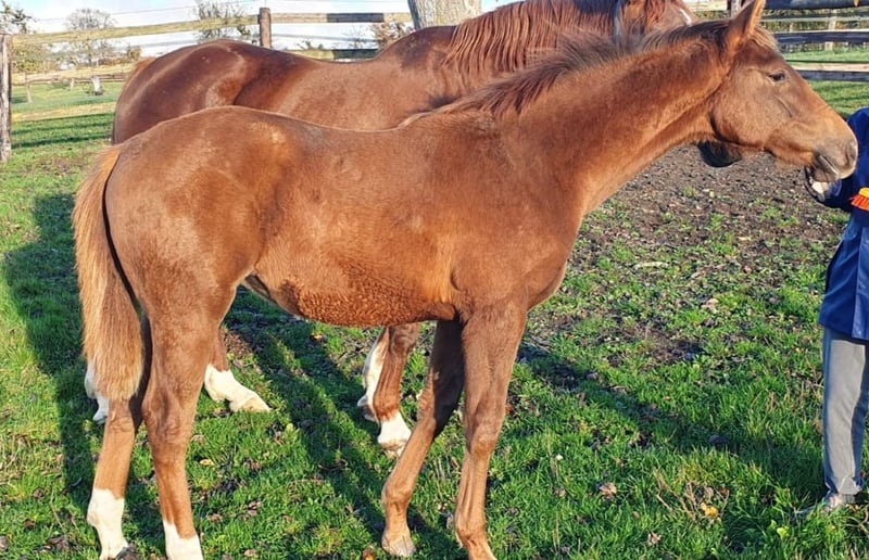 This magnificent Selle Français filly captivates with her presence, expression, and modern conformation. Bred from a top-quality cross, she combines the power of German dressage with the finesse and versatility of the best French bloodlines. A daughter of the renowned Vitalis, a world-class dressage sire and sire of numerous international performers, she inherits expressive, elastic gaits and a naturally uphill movement. Her dam, Temesis (by Ciel d’Espoir, also known as Quattro B), has also excelled in pure dressage up to the St. Georges level (IDR 127), with a remarkable career from a young age: winner at the Haras du Pin Regional Championships at age 3 – in conformation, movement, and free jumping. The maternal line is particularly strong: a maternal aunt, Praga, has an IDR of 136; an uncle, a private stallion, has an ISO of 131, demonstrating a truly versatile, performance-oriented pedigree with distinguished horses in dressage, show jumping, and conformation. Praga is a well-handled, balanced filly, very people-oriented, with an exemplary temperament. She is raised in excellent conditions, regularly monitored (farrier, vaccinations, deworming up to date). Her modern build and harmonious frame suggest an adult height between 16.1 and 16.3 hands. She already displays beautiful movement, great energy, bounce, and a willing attitude in training and preparation for breeding competitions. A promising young mare, combining elegance, mental strength, and top-tier genetics, ideal for a rider or breeder seeking to invest in a modern, promising dressage lineage.