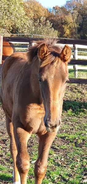Cette magnifique pouliche Selle Français séduit par sa prestance, son expression et son modèle moderne. Issue d’un croisement haut de gamme, elle allie la puissance du dressage allemand à la finesse et la polyvalence des meilleures lignées françaises.Fille du célèbre Vitalis, référence mondiale en dressage et père de nombreux performers internationaux, elle hérite d’allures amples, élastiques et d’une locomotion naturellement ascendante.Sa mère Temesis (par Ciel d’Espoir alias Quattro B) a elle-même brillé en dressage pur jusqu’au niveau Saint-Georges (IDR 127), après une carrière remarquée dès le plus jeune âge : Victoire au Régional du Haras du Pin à 3 ans – modèle, allures et obstacle en liberté et montée. La souche maternelle est particulièrement solide : Une tante de Praga est IDR 136, Un oncle, étalon privé, affiche un ISO 131, témoignant d’une véritable souche mixte performante, avec des chevaux distingués aussi bien en dressage, CSO qu’en Modèles & Allures.Praga est une pouliche bien manipulée, équilibrée et proche de l’homme, au caractère exemplaire. Elle grandit dans d’excellentes conditions, régulièrement suivie (maréchal, vaccins, vermifuges à jour). Son modèle moderne et son cadre harmonieux laissent présager une taille adulte entre 1,65 m et 1,68 m. Elle se distingue déjà par de très belles allures, beaucoup de tonus, de rebond et de bonne volonté dans la préparation et l'exécution des concours d'élevage. Une jeune jument d’avenir, alliant chic, mental et génétique de tout premier plan, idéale pour un cavalier ou un éleveur souhaitant investir dans une lignée dressage moderne et prometteuse.