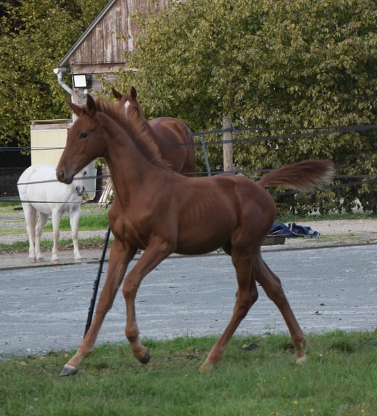 🚀 PROPOSE – Hengstfohlen CSO von Highway TN N.O.P 🚀 Sarthe (72) | Geboren am 23. Mai 2025 | Roter Wallach Sie möchten in die Zukunft investieren? Dann präsentieren wir Ihnen Pallas! Vielversprechende Abstammung für den Sport: ♂️ Vater: Highway TN N.O.P (Eldorado vd Zeshoek x Chellano Z) – Ein äußerst moderner Hengst, der auf höchstem internationalen Niveau erfolgreich ist. – Bekannt für seine Schnelligkeit, seine Respektlosigkeit und seine außergewöhnliche Intelligenz an der Springstange. Diese Qualitäten gibt er an seine Nachkommen weiter, die sich bereits auf internationalen Youngster-Turnieren behaupten. – Seine Konstanz ist außergewöhnlich: Er hat 24 aufeinanderfolgende fehlerfreie Parcours absolviert und gewann 4 Longines-Ranglistenturniere. ♀️ Mutter: Galiska de l’Ortier (Cicero Z x Dollar du Mûrier) – Tochter von Cicero Z und Qurischka de l’Ortier (Dollar du Mûrier x Quat'Sous). Eine vielversprechende Kreuzung, die leider im Alter von 3 Jahren durch eine Verletzung ihre vielversprechende Sportkarriere beenden musste. Die Mutter von GALISKA hat unter anderem Cécedille de l’Ortier hervorgebracht, die in den USA bis 1,45 m springt, sowie Eurêka, dessen vielversprechende Karriere abrupt beendet wurde. Neben seiner Champion-Abstammung besitzt Pallas alle erforderlichen Qualitäten (Kraft, Balance, Mentalität…), um ein vielversprechendes Springpferd zu werden, und für die ambitionierten Züchter auch das Potential, ein Deckhengst zu sein. Pallas ist ein Hengstfohlen, das Sie nicht unberührt lassen wird – er besticht durch seine beeindruckende Präsenz. Zögern Sie nicht, ihn kennenzulernen. Videos auf Anfrage seiner Mutter, Cécedille und Eurêka. Besichtigung in Sarthe möglich.