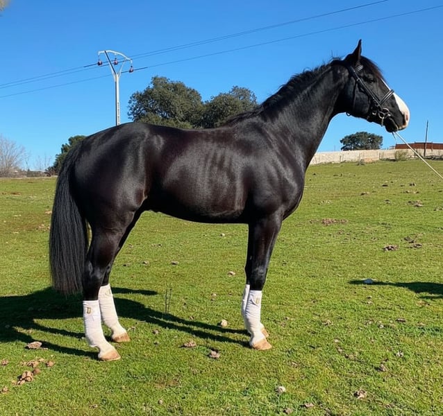 Raza: Silla Francés Fecha nacimiento: 10/01/2019 Documentación: Pasaporte equino. Sexo: Semental (aún no ha cubierto) Alzada a la cruz: 1.70 m Nivel de doma: Transiciones, cesiones a la pierna, iniciándose en el salto de obstáculos apenas lleva un mes, recorridos a 0,90. Apto para amateur y todo tipo de jinetes Precio: 15-25k Descripción: Magnífico caballo de capa negra cuatralbo y careto, con una presencia imponente y gran belleza. Destaca por su físico atlético y bien estructurado, acompañado de unos movimientos armónicos y expresivos que reflejan fuerza y equilibrio. Su mayor virtud es un galope extraordinario: amplio, cadenciado y perfectamente equilibrado, marcando muy bien los tiempos, lo que lo convierte en un caballo especialmente apto para recorridos en salto de obstáculos. Además, posee un carácter fuera de lo común. Noble, manejable y muy colaborador, es un caballo fiable y agradable de montar, apto para jinetes de cualquier nivel. Un ejemplar que combina calidad, funcionalidad y un temperamento excepcional.