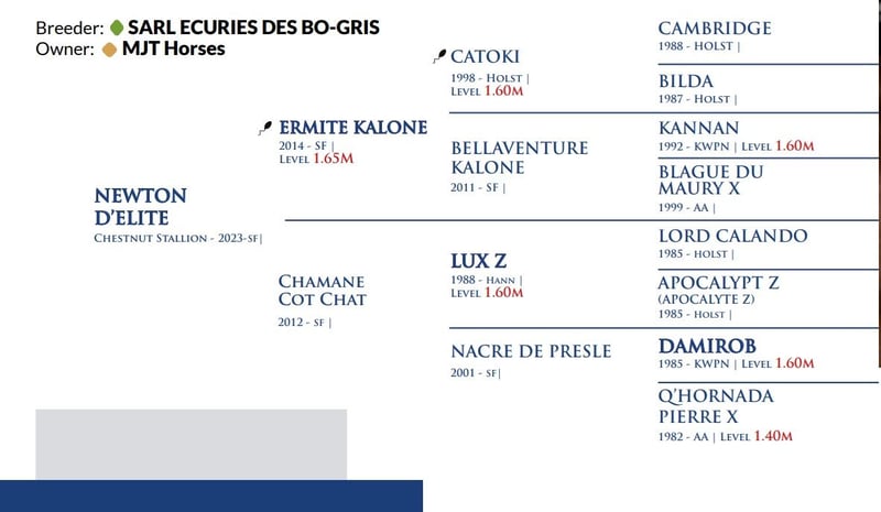 OFERTA STANÓWKI 2026. Posiadamy w naszej ofercie w tym sezonie niesamowicie utalentowane młode ogiery z wybitnych linii żeńskich dające konie GP160. Newton D’Elite. - (Ermitage Kalone x Chamane Cot Chat / Lux Z) - Talent, piękno, dużo krwi. Syn Ermitage Kalone. Newton D’Elite to obiecujący ogier z rodowodem łączącym wybitne osiągnięcia w skokach przez przeszkody oraz doskonałe cechy hodowlane. Udowodnił już swoją wartość na Normandy Horse Show zostając wybranym jako najlepszy dwuletni ogier. Tam też został on wyselekcjonowany i zakupiony przez MJT Horses. Jego ojciec, Ermitage Kalone, to ogier o imponującej karierze sportowej i hodowlanej. Pod wodzą belgijskiego jeźdźca Gilles’a Thomasa, Ermitage Kalone zdobył złoty medal drużynowy oraz brązowy medal indywidualny na Mistrzostwach Europy w A Coruña w 2025 roku, prezentując pięć perfekcyjnych przejazdów. W 2024 roku brał udział w Igrzyskach Olimpijskich w Paryżu, kwalifikując się do finału z czystym przejazdem Jego ojciec, Catoki, to ogier o imponującej karierze sportowej i hodowlanej. W 2010 roku zajął 2. miejsce w konkursie Pucharu Świata w Bordeaux (CSI5*-W), 1. miejsce w Grand Prix w Vigo (CSI5*-W), 2. miejsce w konkursie Pucharu Świata w Helsinkach (CSI5*-). W 2011 roku zajął 1. miejsce w konkursie Pucharu Świata w Bordeaux (CSI5*-W). Catoki to syn ogiera Cambridge, który był wicemistrzem Niemiec w 1993 roku. Matka, Bilda, pochodzi z linii po ogierze Silvester, który był jednym z najważniejszych ogierów skokowych swojej generacji. Matka Ermitage Kalone, Bellaventure Kalone, to klacz o doskonałym rodowodzie i osiągnięciach sportowych. Jej ojciec, Kannan, to ogier o imponującej karierze sportowej i hodowlanej. Kannan, syn ogiera Voltaire, zdobył liczne tytuły w międzynarodowych zawodach skokowych, w tym Grand Prix w Aachen i Rotterdamie. Jego potomstwo, w tym Bellaventure Kalone, dziedziczy po nim doskonałe cechy skokowe. Chamane Cot Chat to córka ogiera Lux Z, który pod Jerrym Smitem w 2000 roku brał udział w Igrzyskach Olimpijskich w Sydney. W tym samym roku zwyciężył w zawodach Pulsar Crown w Cannes. Jej matka Nacre De Presle to córka ogiera Damiro, który zaliczył liczne starty na arenie międzynarodowej poziomu 160 cm. Ten zaś pochodzi od wybitnego skoczka jakim jest Ramiro Z. Od strony matki Damiro możemy znaleźć znakomitego Alme, który nie tylko zasłynął na arenie międzynarodowej ale również jest ojcem wielu koni olimpijskich i zwycięzców grand prix. Rodowód Newtona D’Elite łączy w sobie najlepsze cechy swoich przodków: technikę, moc, szybkość reakcji oraz doskonały charakter sportowy. Jego potomstwo można spodziewać się obdarzone doskonałym zakresem, poprawną techniką i stabilnym temperamentem, gotowym do pracy na najwyższym poziomie. Cena nasienia to jedyne 990 zł netto + 8% VAT. Jest to cena uprawniająca do krycia jednej klaczy przez sezon hodowlany 2026. Do ceny nasienia należy doliczyć koszty dokumentacji 300 zł netto + 23% VAT , oraz koszt wysyłki. Możliwość opisania źrebięcia w PZHK. Wszystkie materiały potrzebne do podjęcia właściwej decyzji znajdziecie państwo poniżej. +48 885 563 658 Maciej www.mjthorses.com KATALOG https://mjthorses.com/_Resources/Persistent/6/f/5/8/6f58f201ad940192b173390324b1276ad64982cc/M_nowe_2026_PL_katalog.pdf YOUTUBE SKOKI OGIERÓW https://youtube.com/playlist?list=PLqJoGiloQ5UgR_JRg-dZT-zvRRoS74V1i&si=FCYWtkgN7Pt6tWva INSTAGRAM https://www.instagram.com/mjt_horses?igsh=ZTZ3OWRva2FtbHY0&utm_source=qr FACEBOOK https://www.facebook.com/share/1BtNmhwzT1/?mibextid=wwXIfr ZAPRASZAMY DO KONTAKTU!