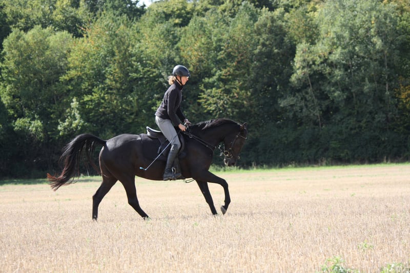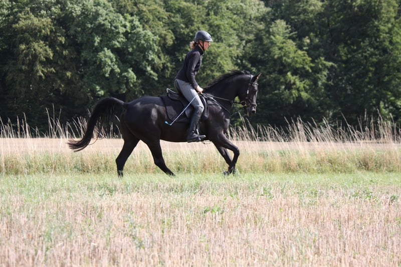 (Reiterin auf Fotos ist 1,75m) Galina hat sich über den Sommer toll entwickelt und spielt auch mal bei weniger routinierten Reitern gut mit. Kleine Hindernisse absolviert sie routiniert und im Gelände ließ sie sich zu Hause und auf kleinen Ausflügen gut regulieren und ging mutig beispielsweise auch an Spargel-Erntemaschinen, zwischen Folie-bedeckten Feldern, vorbei. Sie geht eifrig auf den Hänger bleibt beim Putzen und Aufsitzen brav stehen und kann jetzt mit gutem Gefühl abgegeben werden. Ausgestattet mit drei wirklich guten Grundgangarten (v. a. Schritt und Galopp!), ist Galina super bequem zu sitzen, immer sehr bewegungsfreudig und begierig darauf zu lernen (Reaktion auf Touchieren, Seitengänge, Übergänge etc.). Bei uns stand sie nur nachts in der Box und tagsüber mit anderen Pferden in Ausläufen oder auf der Weide. Galina wäre aufgrund ihrer Abstammung auch für die Zucht sehr interessant. Sie ist ein seltener Nachkommen von Midas. Für jede Frage stehe ich gerne zur Verfügung.