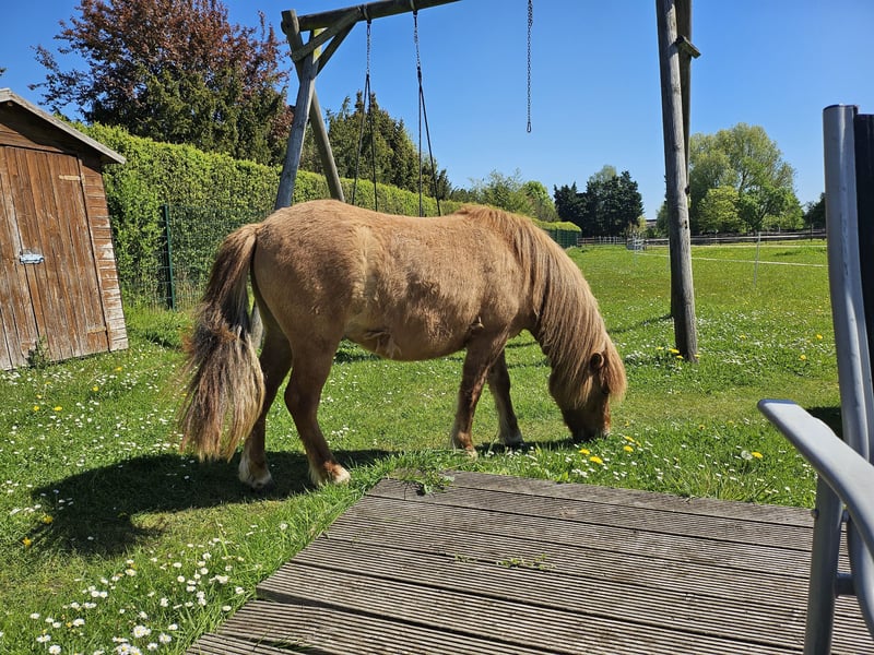 XXL Shetty Mann hält nach neuem Wirkungskreis Ausschau. (Er ist wieder zu haben) 2,5 jähriger Fuchsfalbwallach von Kölnäs Wiktor aus einer StPSt von Chris van't Zand x Ambitie v.d Zandkamp im ganzen großen Maß (aktuell gemessen mit 111cm Endmass ca 115cm) , superlieb im Umgang, auch anderen Ponys gegenüber. Noch etwas schüchtern Fremden gegenüber, aber wenn man einmal sein Herz erobert hat weicht er einem nicht mehr von der Seite. Er kennt anbinden, putzen, Spaziergänge, Anhänger fahren, gibt brav alle 4 Hufe, Hunde und Trecker sind auch nichts unbekanntes für ihn, liebt es betüddelt zu werden. Er ist in einer kleinen gemischten Herde aufgewachsen und eher rangniedrig. Ich würde mir am Liebsten eine "für-immer-Bleibe" für ihn als Fahrpony wünschen, aber sicherlich würde er auch ein tolles Kinderpony werden oder einer der Spass an Bodenarbeit hätte. Eigentlich ist er für jeden Blödsinn zu haben ;-) Ich hätte auch noch einen Passer (s.letztes Foto bzw meine andere Anzeige)zu ihm abzugeben.