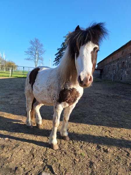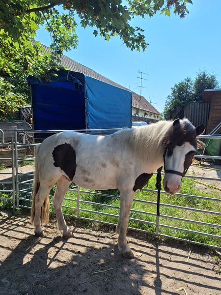 Gelding – pinto, approximately 3'7" (1.10 m), 6 years old. A little comic relief, playful and lively. During walks, he's no couch potato and approaches new people and situations openly. Very gentle with children, stands patiently when groomed and tolerates pretty much everything. He is well-behaved when visiting the farrier and veterinarian. No signs of colic or other health issues. Please feel free to view my other listing as well. Since the ponies are now only a pair, I would prefer to rehome them together. Price is negotiable.