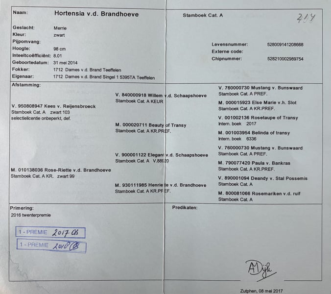 Hortensia von der Brandhoeve ist eine sehr typvolle 1. Prämie Stute. V: Kees v. Reijensbroeck, Rappe, 103 cm, (1. Prämie) M: Rose-Riette v. d. Brandhoeve, Rappe, 99 cm (2007 Tageschamp Ostbrabant) MV: Beauty of Transy Kr.pref. (beste NL-Stute) Für die Zucht sehr interessant durch die beste Abstammung (Transy-Marswood-Linie), Hatte mehrere Fohlen in NL. War Jugendchampion im großen Ma0 und allgemein Jugendchampion. Für 2026 nicht gedeckt. Sie ist rangniedrig. Weil ich aus gesundheitlichen Gründen keine Ponys mehr ausbilden kann, wird sie als roh nur in vernünftige Züchterhände abgegeben.
