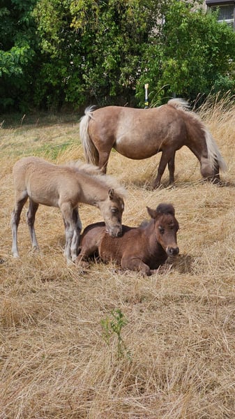 Verkaufe Shetland Pony Stutfohlen vom 23.04.25 im der Sonderfarbe smokey black. Ihre Mutter Destina vom Erzgebirge (1.03) ist eine Cremellostute und gibt definitiv ein Cremegen mit, so dass ihre Nachkommen eine Sonderfarbe erhalten. Der Vater Wesper v.d. Biezenakker ist 1.06m und hat der kleinen Dame genügend Rahmen, Stabilität und Korrektheit vererbt. Sie bekommt volle Papiere und wächst unproblematisch& robust in einer Stuten-/Fohlenherde auf. Beim Auszug sind natürlich regelmäßig die Hufe bearbeitet worden und der Pass & Papiere vorhanden und sie ist gechippt. Transport sowie weitere Aufzucht in gemischter Shettyherde möglich