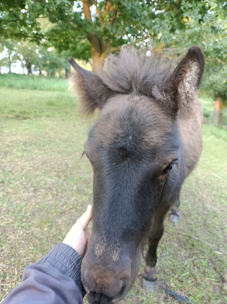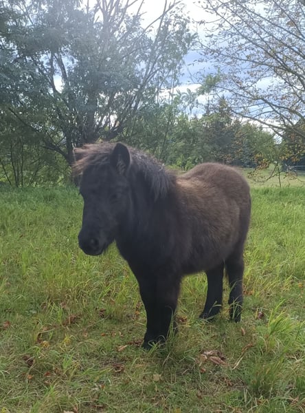 À vendre pouliche Shetland née le 23.04.25 dans la couleur rare smokey black. Sa mère, Destina vom Erzgebirge (1,03 m), est une jument cremello et transmettra certainement un gène crème, ce qui permettra à sa descendance d'avoir une couleur rare. Le père, Wesper v.d. Biezenakker, mesure 1,06 m et a transmis à cette petite dame une bonne taille, de la stabilité et de la conformité. Elle sera vendue avec des papiers complets et grandira sans problème et de manière robuste dans un troupeau de juments et de poulains. Lors de son départ, ses sabots auront bien sûr été régulièrement entretenus et le passeport ainsi que les papiers seront en règle, et elle sera identifiée par puce. Le transport ainsi qu'une poursuite de l'élevage dans un troupeau mixte de Shetlands sont possibles.