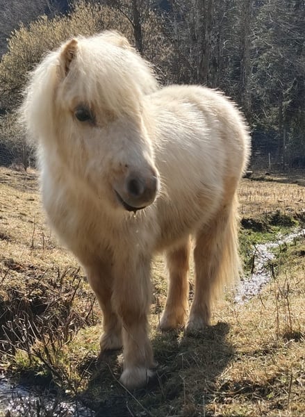 Will be one year old on May 10th. Color is Isabell (Palomino). Regularly dewormed, vaccinated against tetanus twice, and receives regular hoof care. Slightly fence-shy, familiar with children and various farm animals. Halter-trained. Well-built and exceptionally cute! Estimated final height (Gypsy measurement): approximately 85-90 cm!