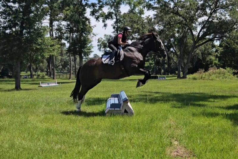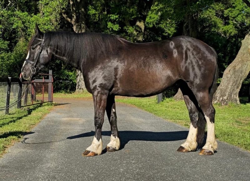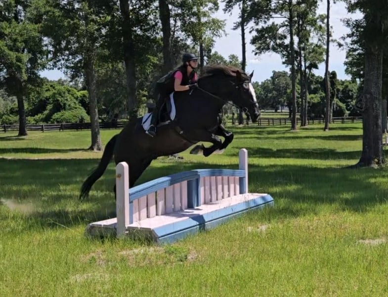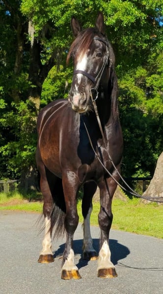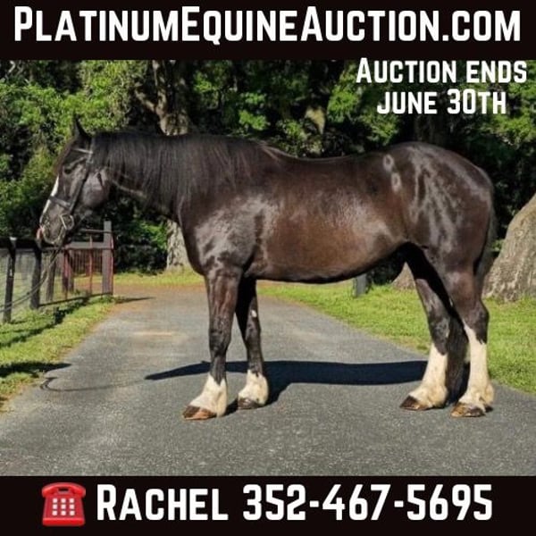 ONLINE AUCTION PLACE YOUR BIDS AT PLATINUMEQUINEAUCTION DOT COM $3500 STARTING BID AUCTION ENDS JUNE 30TH Introducing Moonshine! A stunning 9yr 16.3h Shire x QH cross gelding with a one-in-a-million brain! Calm, sweet, and comfortable push ride. Moonshine has years of experience fox hunting and doing guided beach trail rides with beginner riders. He is accustomed to riding around traffic, bicycles, dogs, and water. Moonshine loves schooling cross country and going to hunter paces to jump all the things…ditches, banks, coops, logs, rock walls, etc. He has a smooth, flat jump that is easy for riders starting over fences. Moonshine is easy to load, haul, tie, bathe, trim, etc. He has a scar on his neck from being bit by a stallion as a baby. It has been evaluated by the vet and does not bother him. Moonshine is a barefoot easy keeper with no vices or maintenance. He turns out in a mixed herd and keeps a clean stall. He is up-to-date on shots, Coggins, floating, deworming, sheath cleaning, and hoof trimming. If you’re looking for a large all-around draft cross to trail ride, jump, or fox hunt, don’t miss out on this awesome horse! Moonshine is located in Ocala, Florida and shipping can be arranged anywhere in the country. Please call Rachel with Show Me Sport Horses at 352-467-5695 with any questions. Located in Ocala, FL.
