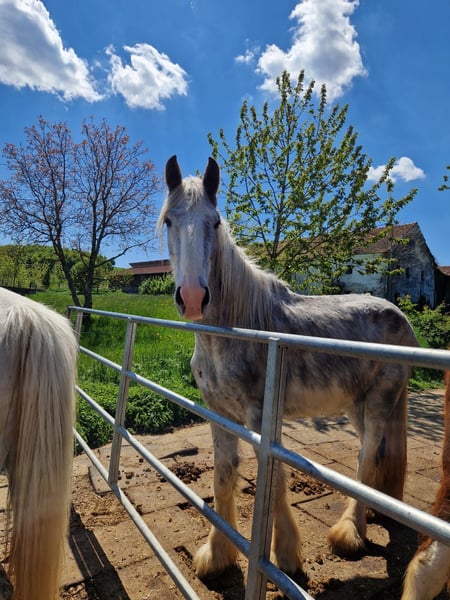 Numero Due was born in spring 2022 and is a very special young Shire Horse gelding. He comes from our own breeding and has been accompanied with a lot of love and care since birth. Both parents are distinguished by their friendly and balanced character. As a result, Numero Due is also an exceptionally people-oriented gelding. He actively seeks closeness, enjoys being petted, and loves walks. He also enjoys learning new things. Numero Due has grown up in a mixed herd with his peers on our spacious pastures, which we believe is particularly important for the health and balance of our horses. For Numero Due, we are now - after long considerations - looking for a special place due to his handicap. Unfortunately, Numero Due is "over at the knee." For those who are not familiar with this term: "Over at the knee" means that the fetlock joint – the area above the hoof – is more lowered than usual. This leads to a softer, sometimes unstable position of the leg. In Numero Due's case, this means that he will not be rideable permanently – even in the long term. This diagnosis is painful, of course, because Numero Due has everything one could wish for from a Shire Horse in every other respect. However, his health conditions do not allow for riding use. That is exactly why we are looking for a special place for him as a companion horse: He loves the company of other horses, is social and very playful in the herd, uncomplicated to handle, and gives his caregivers genuine trust. For people who want to provide a friendly companion for a second or third horse – whether in the pasture or in an open stable – Numero Due is a treasure. Also, people looking for a horse to "love" or to "let their soul dangle" or for extended walks together, without riding being the focus, should feel free to contact us. He can also be taken along as a lead horse, as our veterinarian says that movement is positive for him. He also enjoys all activities. Of course, Numero Due is halter-trained, knows the grooming area, hoof care, and has had some positive experiences with trailer rides. He is well-behaved and uncomplicated with the veterinarian and farrier. He is sound and walks perfectly in the group. His handicap does not limit his desire to move at all. In the herd, he is very playful, so he is not necessarily suitable as a partner for older horses, as this could become stressful at times. We could also imagine him as a companion for a peaceful, not too dominant stallion so that he does not have to be alone. He has also been kept with stallions in the past, and this has always worked perfectly. It is important to emphasize that this is not an urgent sale. We have time for Numero Due until we find the right home for him. A place where he is appreciated for who he is: as a loving, non-rideable companion who touches hearts with his gentle and people-oriented nature. Therefore, we kindly ask dealers to refrain from inquiries. The asking price is well below what a Shire Horse would normally cost – but only if it is ensured that Numero Due will not be ridden. This is a prerequisite for us. Because we want his life to be characterized by care, peace, and companionship – not by expectations that he cannot meet due to health reasons. For Numero Due, place comes before price. We would be very pleased to receive a brief description of the future home. Numero Due currently lives near Bad Füssing. If interested, we are happy to send more information, pictures, and videos and arrange a meeting. We also like to provide insights into our daily life with the horses on our WhatsApp channel. Anyone who can imagine offering Numero Due a loving home as a companion is very welcome to contact us.
