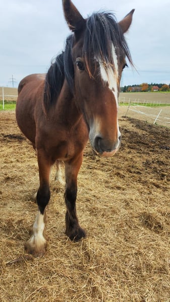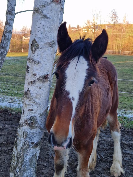 Thank you for your interest in our Shire Horse mare Ashanti. Ashanti is a particularly charming mare for sale, distinguished by her beautiful coloring and her sweet character. Shire Horse mare Ashanti was born in the summer of 2024 and is a curious and people-oriented young Shire horse lady. She comes from our own breeding and has been in our care from the very first moment. Both parent animals also impress with their balanced and loving character. Ashanti is growing up with her foal friends in a mixed herd on our spacious pastures. We wish for her a new home with plenty of horse companionship and playmates. In the group, she is confident and sociable. She is very affectionate towards humans, uncomplicated, and curious. She is halter-trained and knows all the things a weanling should know. She currently finds hoof care a bit annoying, but we are intensively working with her on this. Of course, Ashanti is chipped, vaccinated, regularly dewormed, and her hooves are maintained. Both parent animals are registered breeding animals of the English Shire Horse Society. Therefore, it is fundamentally conceivable for Ashanti to be used as a breeding mare in a few years. If you are looking for an exceptionally beautiful Shire Horse with a gentle and people-oriented character, which you would like to lovingly accompany as a partner in your life, please feel free to contact us. Our animals are only placed in the best hands and an age-appropriate home, so it is important to us to take enough time for interested parties. It is also important to us that the horse has a say in the decision, as the chemistry must also be right for our animals. We would be happy to arrange a non-binding meeting with Ashanti as a "Shire Horse Day or Weekend" at our farm, so that a mutual "getting to know each other" can take place in a calm and stress-free manner. Ashanti lives near Bad Füssing, and we will gladly send the exact address upon scheduling an appointment. There are overnight accommodations with great food within walking distance of our farm. Additionally, there are several beautiful spas and swimming lakes in the vicinity, making a small vacation in our area definitely worthwhile. "Non-riders" are also very warmly welcomed here. We also offer guided rides and hikes with our gentle giants in beautiful nature. Less experienced riders are welcome to join us; in this case, the horse will be led from the ground. Gift vouchers for this are also available and have already provided many lovely (birthday) surprises. Further impressions of our horses can also be found on our WhatsApp channel. If you are interested, we would be happy to send you the link. We look forward to your message.