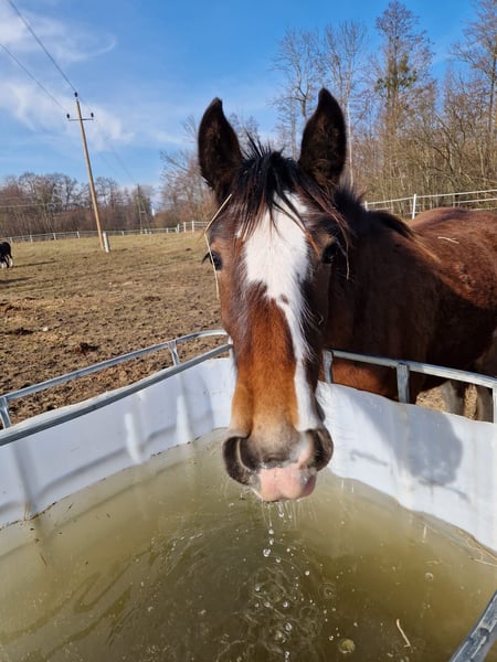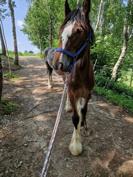 Hartelijk dank voor uw interesse in onze Shire Horse merrie Ashanti. Met Ashanti staat er een bijzonder schattige merrie te koop, die enerzijds door haar prachtige kleur en anderzijds door haar lieve karakter opvalt. Shire Horse merrie Ashanti is geboren in de zomer van 2024 en is een nieuwsgierige en mensgerichte jonge Shirehorse-dame. Ze komt uit onze eigen fokkerij en is vanaf het allereerste moment onder onze hoede. Beide ouders hebben ook een evenwichtig en lief karakter. Ashanti groeit samen met haar veulenvrienden op in een gemengde kudde op onze uitgestrekte weidegronden. We wensen voor haar in ieder geval een nieuw thuis met veel paardengezelschap en speelkameraadjes. In de groep is ze zelfverzekerd en sociaal. Ze is zeer aanhankelijk naar mensen, ongecompliceerd en nieuwsgierig. Ze is halstergebroken en kent alle dingen die een afgezette moet kennen. Ze vindt hoefverzorging momenteel vervelend, maar we oefenen intensief met haar. Natuurlijk is Ashanti gechipt, gevaccineerd en wordt ze regelmatig ontwormd en krijgen haar hoeven verzorging. Beide ouders zijn geregistreerde fokdieren van de Engelse Shire Horse Society. Daarom is het ook voor Ashanti denkbaar om over een paar jaar als fokmerrie ingezet te worden. Wie op zoek is naar een uitzonderlijk mooi Shire Horse met een zacht en mensgericht karakter, dat hij of zij liefdevol als partner aan zijn of haar zijde wil begeleiden, kan zich gerust bij ons melden. Onze dieren worden alleen in de beste handen en een leeftijdsadequaat thuis gegeven, daarom is het voor ons belangrijk om voldoende tijd voor geïnteresseerden te nemen. Ook is het voor ons belangrijk dat het paard mee beslist, want ook voor onze dieren moet de chemie kloppen. Graag kan er een vrijblijvende kennismaking met Ashanti worden georganiseerd als een "Shire-Horse-dag of -weekend" op onze boerderij, zodat een wederzijds "snuffelen" rustig en stressvrij kan plaatsvinden. Ashanti woont in de buurt van Bad Füssing, het exacte adres sturen we graag toe bij het maken van een afspraak. Er zijn overnachtingsmogelijkheden met heerlijk eten op loopafstand van onze boerderij. In de nabije omgeving zijn er bovendien enkele mooie thermen en zwemmeren, zodat een kleine vakantie in onze buurt zeker de moeite waard is. Ook "niet-ruiters" zijn bij ons van harte welkom. Daarnaast bieden we begeleide ritten en wandelingen met onze zachte reuzen in prachtige natuur aan. Minder ervaren ruiters zijn ook van harte welkom om mee te gaan, in dat geval wordt het paard vanaf de grond geleid. Vouchers hiervoor zijn ook bij ons verkrijgbaar en hebben al menig mooie (verjaardags)verrassing bezorgd. Verder zijn er ook indrukken van onze paarden te vinden op ons Whatsapp-kanaal. Bij interesse sturen we de link graag toe. We kijken uit naar uw bericht.
