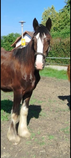 Thank you for your interest in our Shire Horse filly Eve. Eve was born in the summer of 2023 and will soon be able to move into a species-appropriate, new home with a horse company. Her teddy bear look is particularly striking, which has earned her the nickname "Flauschi". Eve grows up in a herd and spends a lot of time with her playmates every day. She is very people-oriented and sweet to deal with, loves long strokes and is always curious and playful. But she also likes to test. She knows the halter and can already be led well. Of course, she will be dewormed regularly and provided with all the necessary vaccinations at the time of delivery. Eve also coped well with the first farrier visits. Both parents can be viewed on our farm. If you are looking for a Shire Horse with a gentle and people-oriented character, which you would like to lovingly accompany to your life as a partner at your side, please contact us, preferably via whatsapp. Our animals are only given into the best hands and an age-appropriate home, so it is important to us to take enough time for interested parties. We look forward to hearing from Eve.