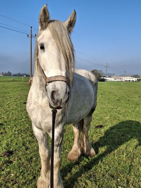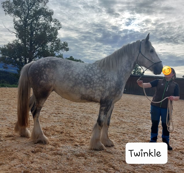 Thank you for your interest in our Shire Horse mare, Twinkle. Twinkle was born in 2019 and currently stands at approximately 1.75 m, although she is still growing. She has full papers from the English Shire Horse Society. She comes from our breeding program and has been raised from the beginning with other foals and later in a mixed herd. Both her parents impress with their balanced and friendly character. Twinkle has grown up in a herd environment and is familiar with both 24/7 outdoor living and stable life. She currently lives in an open stable but is also accustomed to a box. In the group, she is rather high-ranking but also enjoys mutual grooming with her horse friends. Now that she is 5 years old, we have started her training under saddle. Twinkle impresses with her quick comprehension and calm demeanor. If she doesn't understand something, she stands still instead of getting nervous. She is people-oriented and curious. All our horses are gently started under saddle from the age of 5. Until then, we focus on basic obedience, groundwork, and desensitization training. Working with Twinkle is particularly enjoyable due to her motivation and enthusiasm. Of course, she has all the necessary vaccinations and is regularly dewormed and seen by the farrier. Twinkle is uncomplicated with both the vet and the farrier, she lifts her hooves willingly and is easy to handle in general. Trailer loading is also not a problem for her. If you are interested, an informal meeting is always welcome, and we are best reached via WhatsApp for more information. Our animals are only placed in the best hands and an age-appropriate home, so it is important for us to take sufficient time with potential buyers. It is also important to us that the horse has a say, as the chemistry must be right for our animals too. The displayed pictures include both very recent photos and ones from her training last year and two years ago, so Twinkle's color has changed over time. We would be happy to arrange an informal meeting with Twinkle as a "Shire Horse Day or Weekend" at our farm, allowing for a relaxed and stress-free introduction. Twinkle lives near Bad Füssing. Accommodation with great food is within walking distance of our farm. There are also several beautiful thermal spas nearby, making a short vacation in our area worthwhile. Non-riders are also very welcome. We also offer guided rides and hikes with our gentle giants in beautiful nature. Less experienced riders are welcome to join, and in such cases, the horse will be led from the ground. Vouchers for these activities are also available and have made for some lovely birthday surprises. Further impressions of our horses can be found on our WhatsApp channel. If interested, we are happy to send the link.