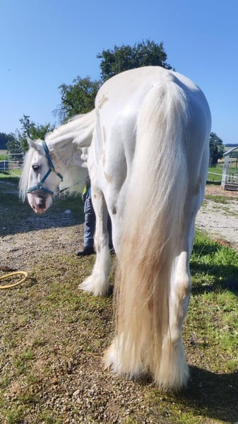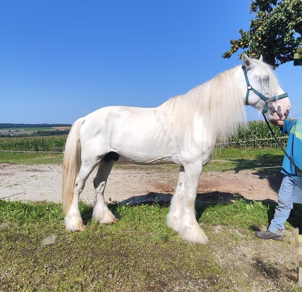 Vente d’un élégant étalon de Shire – idéal pour les loisirs et la pratique amateur Nous proposons à la vente un impressionnant étalon de Shire, né en 2016. Ce magnifique gris perle impressionne par sa stature imposante et sa nature calme et amicale. Avec une taille au garrot de 180 cm, il attire tous les regards et est parfaitement adapté pour une utilisation en loisir. L’étalon est en bonne santé, vigilant et bien dressé. Il se montre extrêmement doux en main et est facile à gérer aussi bien en extérieur qu’au box. Sa nature tranquille en fait le partenaire idéal, aussi bien pour des cavaliers expérimentés que pour des débutants ambitieux à la recherche d’un compagnon fiable pour les loisirs. Pour toute question ou information complémentaire, je reste à votre disposition. Visite et essais sur demande.