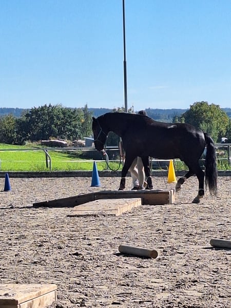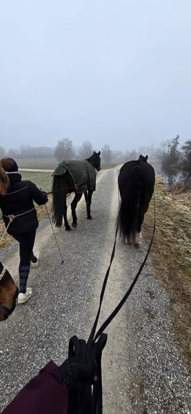 Miro Schlesisches WB – 165cm Stkm – Geboren Juni 2012 Miro ist ein sensibles, lernwilliges, verschmustes und liebes Charakterpferd. Wir sind knapp 6 Jahre zusammen einen spannenden und lehrreichen Weg gegangen aber nun ist es Zeit sich zu trennen. Miro kam mit ca 8 Jahren als grob angerittenes und dann nur gefahrenes Kutschpferd zu uns. Das, was uns damals schon die Hoffnung gegeben hat das er auch ein tolles Reitpferd werden kann, ist seine menschenbezogene und aufgeschlossene Art. Mittlerweile kennt er Reiten in der Halle in allen drei Grundgangarten, Seitwärts, Travers, Schulterherein. (Reiten nach Grundsätzen der Legerete, Klassischen Reitkunst – „hoher“ Kopf) Ausreiten allein und in der Gruppe Schlitten und Egge ziehen Anhängerfahren Trailparcours Wanderritt Als Handpferd neben dem Fahrrad laufen (S+T) Podest und Wippe ( kann mit verkauft werden) Sprünge bis 50cm Spazieren am Halsring Er wurde von mir ausnahmslos gebisslos geritten / bewegt / gefahren. Er reagiert fein mit wenig Einwirkung. Am liebsten aber „arbeitet“ er frei mit dem Menschen und darf seine eigenen Ideen einbringen. Er reagiert sehr gut auf Stimme und wurde von mir mit viel Körpersprache ausgebildet. Er kennt es für alles positives oder „negatives“ Stimmfeedback zu erhalten. Meiner Einschätzung und Erfahrung nach ist er KEIN Kinderpferd. Als Barhufbearbeiterin habe ich seine Hufe immer in einem funktionalen Zustand gehalten. Mittlerweile „trimmt“ sich die Kapsel von selbst sehr gut. Leichte Schiefenkorrekturen hinten müssen weiter vorgenommen werden. Gerne gebe ich dazu eine „Anleitung“ mit auf den Weg. Keine Rehe, Abszesse, Fäule o.ä. Bei längeren Ausritten oder sehr steinigen Wegen haben wir Ihm Hufschuhe angezogen. (werden mitgegeben) Er wurde mehrmals im Jahr Osteopathisch behandelt / unterstützt. Seine Schwächen sind: Das rechte hintere Bein wurde durch das lange einseitige Einspannen (immer rechts außen nach innen gebogen) beim Kutschefahren nicht vernünftig “ausgebildet". Er läuft daher „auf der Hinterachse“ nicht 100% klar z.b. bei nasskaltem Wetter o.ä. Manchmal „Vergisst“ er das Bein auch einfach ;) Ist aber keine Einschränkung für Reiten, Fahren etc, man muss nur etwas Rücksicht darauf nehmen bzw sieht an dem Bein wie sein allgemeiner (energetischer) Zustand gerade ist. Durch die diagonale Schiefe ist sein Huf VL etwas verkleinert / schmäler Da er ein sensibler Typ ist kann er mit Stress nicht sehr gut umgehen und wird dann unruhig (hauptsächlich guckig oder leichte Magenempfindlichkeit). Zahnfleischfisteln - bisher nur am Eckzahn unten links ( ½ Jährlicher Zahnarzt nötig) Er neigt NICHT zum Koliken (hatte in den 5 Jahren bei uns keine einzige) – insgesamt robuste Konstitution, wurde nur bei Dauerregen unter 10°C eingedeckt. Er ist kein Durchgänger oder „Renner“. Er bleibt bei unklaren Situationen immer stehen und kuckt erstmal wie angewurzelt. In sehr ungünstigen Situationen wie, kompletter Überforderung / unpassender drückender Sattel im hinteren Bereich / zu schwerem Reiter kann er mit Buckeln reagieren. War anfangs ein Problem aber seit einigen Jahren stabil gut. >>> Passender 18“ Dressursattel sollte mit übernommen werden. Miro ist absolut sozialkompetent und ordnete sich bisher immer im „Mittelfeld“ ein. Er ist tolerant gegenüber sozial schwächeren, zickigen Stuten und allen anderen die freundlich zu ihm sind. Wenn Ihm jemand unsympathisch ist versucht er sich demjenigen zu entziehen. Hat noch nie gebissen oder böse getreten. Er möchte immer „Everybody´s Darling“ sein, Mensch wie Tier gegenüber. Springt 100%ig NICHT auf ! Er stand bisher immer tagsüber in gemischter Herdenhaltung + Nachts in der Box . Ich könnte mir aber auch vorstellen das er in einem Offenstall klarkommen würde mit einer kleinen Herde. In reine Boxenhaltung / Einzelhaltung mit stundenweiser Koppel verkaufe ich Ihn nicht ! Ich suche jemanden für Ihn, der Ihn weiter in der Freiarbeit sein Können zeigen lässt, Geduld mit Ihm hat wenn er mal wieder unsicher ist, Ihn nicht in eine Form pressen möchte sondern liebevoll fördert und auch mal ein Nein akzeptiert. Er wird alles geben was er kann. Da Ihn mein „Action/PowerProgramm“ auf Dauer gestresst hat suche ich einen NICHT Abenteuerlustigen neuen Menschen für Ihn. Routinen und „Gewohntes“ sind ihm sehr wichtig! Trotz seines kräftigeren Körperbaus sollte der Reiter nicht mehr als 75-80kg wiegen. Seine Vor- und Krankengeschichte seit seiner Geburt ist transparent und bekannt. Platz vor Preis für diesen tollen Allrounder :) Idealerweise möchten meine Mutter und ich sein neues Zuhause besichtigen und weiter freundschaftlichen Kontakt pflegen und bei auftauchenden Fragen unterstützen – wenn gewünscht. Platzvergabe innerhalb von Bayern bevorzugt. Absolut kein Notverkauf! Anrufe unter der Woche bitte erst ab 17:00 01515 9207098 Jasmin Findorff