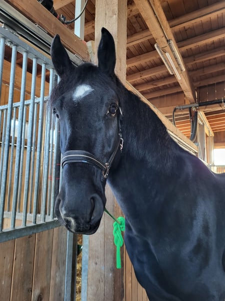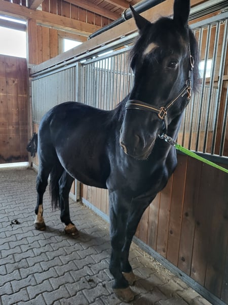 If we cannot be together, then we must part ways. I am offering my stunning black gelding for sale. I purchased him directly from a breeder in Poland four months ago, and he has been with me ever since. Apollo is experienced with both herd and solitary turnout in a paddock box with access to pasture. He is familiar with saddle, bridle, lunging... He is already ridden and has also been driven in Poland before. Unfortunately, due to his excitable and nervous nature in unfamiliar environments, he is not a reliable riding horse for beginners. He needs a confident rider who can dedicate time daily and continue his training consistently, ideally in an indoor arena where he can settle in familiar surroundings. He has an incredible amount of "go," which is quite unusual for his breed. He was dewormed in July and is vaccinated against influenza and tetanus. He has also recently been treated by a dentist and an osteopath. He is shod for winter, so he is accustomed to farrier visits. I am only responding to serious inquiries and wish for him to find the best home in the world with someone who has patience, time, and a big heart.