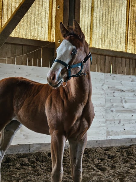 Sparky is an outgoing and curious young stallion with an excellent pedigree. In terms of character, the stallion is really cool and fearless, well-behaved, very calm, affectionate and cuddly. Sparky's mega calmness, which his ancestors also brought with them, will make his offspring super suitable for the modern leisure rider. Sparky is in reining training. DQHA/ AQHA registered. 5 Panel N/N. His lineage leaves nothing to be desired. *COLONELS SMOKING GUN x HOLLYWOOD DUN IT x SHINING SPARK* All three NRHA Million Dollar stallions were combined in his pedigree. The first offspring will be born in 2024. For further questions please contact us.