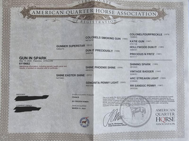 Sparky est un jeune étalon ouvert et curieux avec d'excellentes origines. Du point de vue du caractère, l'étalon est vraiment cool et intrépide, brave, très calme, affectueux et câlin. Grâce à la sérénité de Sparky, qui était déjà celle de ses ancêtres, ses descendants conviendront parfaitement aux cavaliers de loisirs modernes. Sparky est en formation de reining. Enregistré DQHA/ AQHA. 5 Panel N/N. Sa lignée ne laisse rien à désirer. *COLONELS SMOKING GUN x HOLLYWOOD DUN IT x SHINING SPARK*. Les trois étalons NRHA Million Dollar ont été réunis dans son pedigree. En 2024, ses premiers descendants verront le jour. N'hésitez pas à nous contacter si vous avez d'autres questions.
